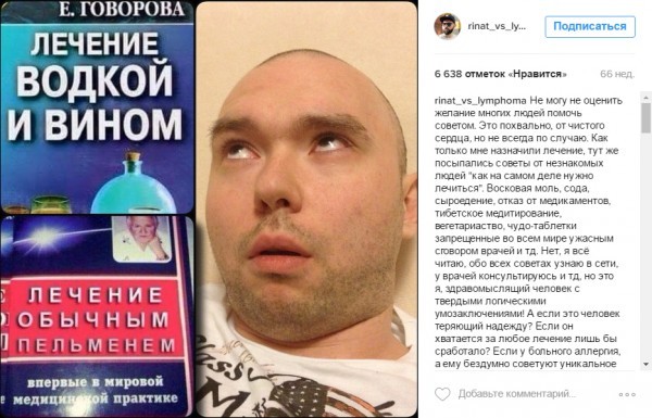 Я тоже читал много абсурдных рекомендаций: лечение пельменями, одеялом из усиков барсука. Всегда есть люди, знающие по теме лечения онкологии больше врачей: «Не ходи там, где много народа, ешь свеклу, не ешь свеклу, только голодание тебя спасет, к ботинкам купи шляпу, мы лечили стоматит жареным изюмом, купи воду и пей вместо еды, постоянно плавай, не нюхай сахар…» Однажды у меня заболело горло, и я попросил читателей меня пощадить! Уж с горлом-то я мог справиться сам.