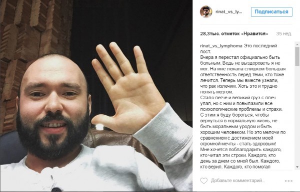 Каждый раз, когда я слышу, что я – «крутой», «молодец», «красавчик», меня одолевает смятение и немного стыд, потому что я себя таким не ощущаю. Не выздороветь я не мог, меня читали тысячи людей. На мне лежала слишком большая ответственность перед теми, кто тоже лечится. Теперь мы вместе узнали, что рак победим.