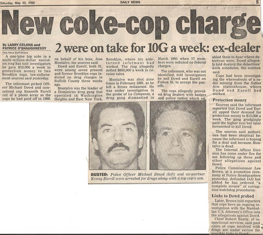 Помните, мы говорили, что это классическая история? Заместитель Диаза Элвис уже давно являлся информатором. В мае 1992 года последовали аресты 54 человек, из них шестеро полицейских, включая Дауда и Юрэлла. Скандал принял национальный размах, передовицы пестрели фотографиями закованных в наручники копов.