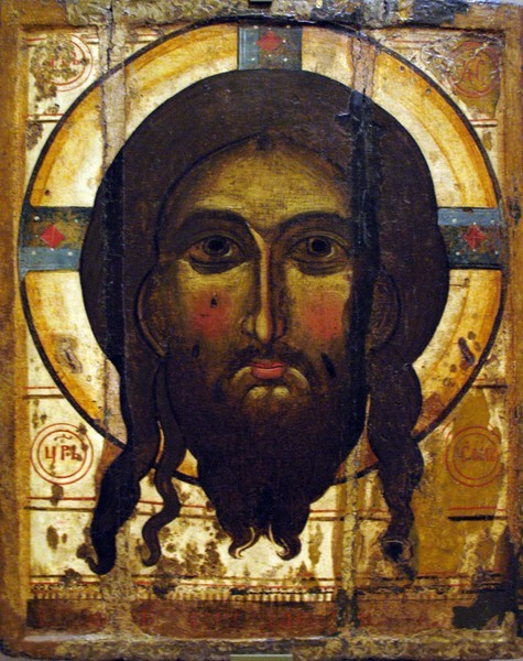 Почему нерукотворный? Об этом есть две легенды, одна восточного происхождения, другая — западного. Западная легенда рассказывает, что когда Христос нес крест на Голгофу, то по Его лицу текли кровавый пот и слезы, и женщина по имени Вероника, встретившаяся ему на пути, сняла с себя платок, вытерла Его лицо, и на этом платке запечатлелся Его лик. А восточная легенда связана с правившим в Эдессе царем по имени Авгарь.