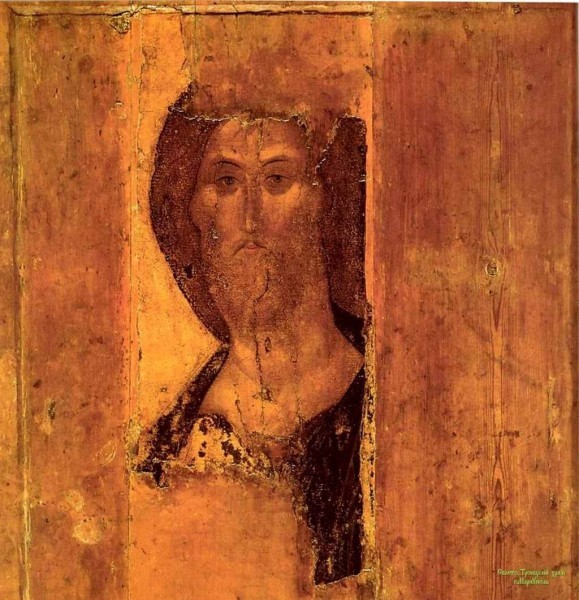 А это Спас Звенигородский, приписываемый Андрею Рублеву, и это, конечно, лик. Когда вы смотрите на него, вам не приходит в голову думать, как это написано, вы вообще забываете о художнике, об авторе, вы предстоите перед самим Богом, вам кажется, что это сам Христос смотрит на вас с этой, в общем, поврежденной доски.