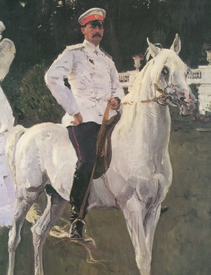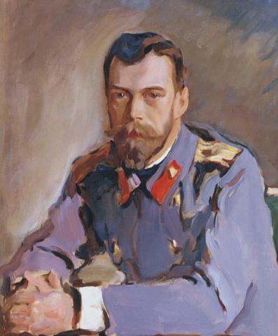 А вот это потрясающий портрет — это Николай II. Вспомните парадные портреты петровского времени и посмотрите на этот портрет. Это человек, обреченный на гибель. И портрет-то небольшой, может быть 70х70, серый фон, серый мундир, серые, оловянные, ничего не выражающие глаза, безвольно опущенные руки.