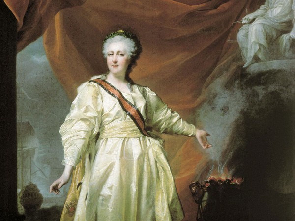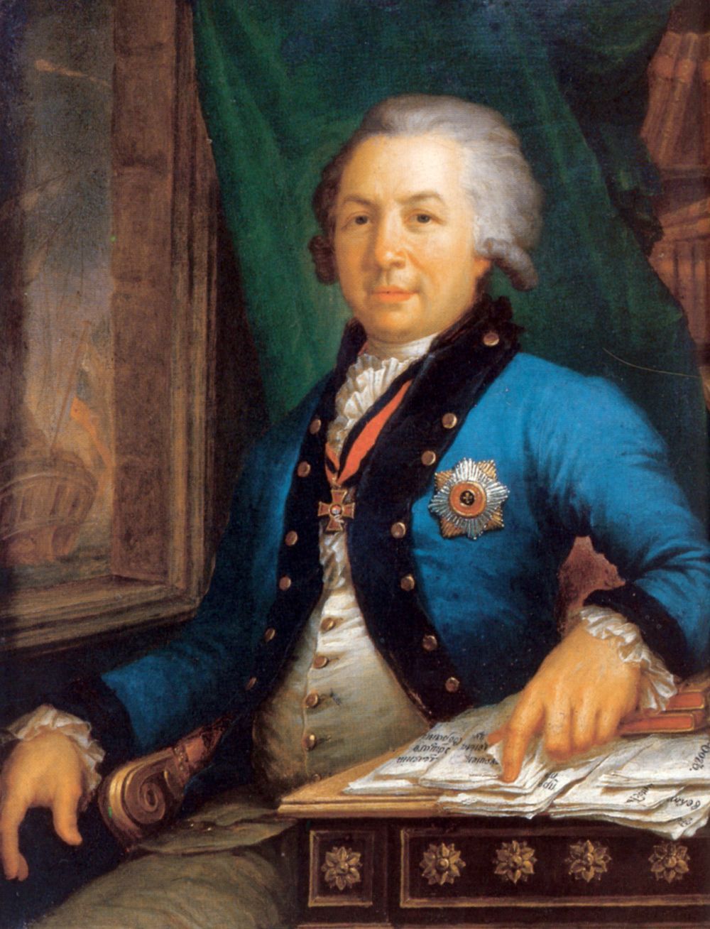 Где описана такая прогулка Екатерины II? Не помните? «Капитанская дочка». Помните, Маша Гринева встретила ее, гуляя в Царскосельском саду? Именно такой она и была, она вдохновила Пушкина. А это портрет Державина. Державин, как известно, был генерал-прокурором.