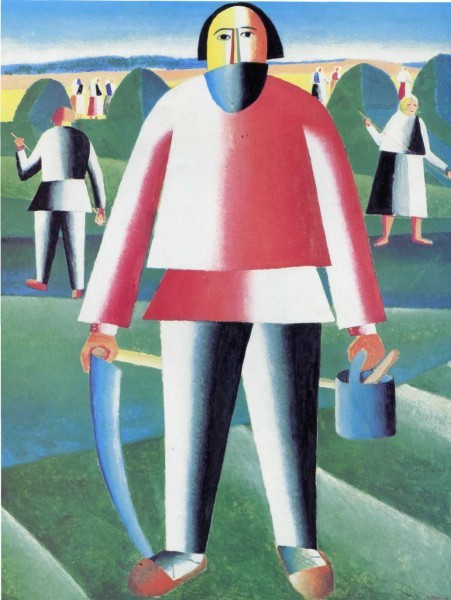 Но вернемся к Малевичу. Его фигуры тяготеют к геометрическим формам, он утверждал, что у человека вообще нет лица, лицо есть только у Бога, портреты представляют собой наборы разных форм, составленных из отдельных фрагментов, Малевич отвергал внешнюю оболочку реальных вещей. Он считал, что он ищет новый космический язык, которым можно сформулировать законы переустройства Вселенной. Вот на что замахнулся теперь художник! Сам он писал об этом так: «Новая моя живопись не принадлежит земле исключительно. Земля брошена, как дом, изъеденный шашлями…. В человеке, в его сознании лежит устремление к пространству, тяготение отрыва от шара Земли».