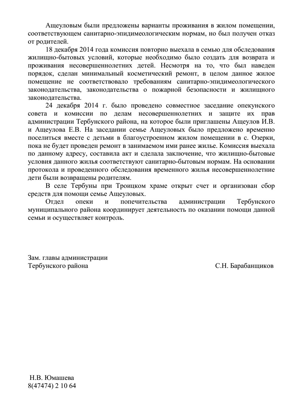 24 декабря 2014 г. было проведено совместное заседание опекунского совета и комиссии по делам несовершеннолетних и защите их прав администрации Тербунского района, на которое были приглашены Ащеулов И.В. и Ащеулова Е.В. На заседании семье Ащеуловых было предложено временно поселиться вместе с детьми в благоустроенном жилом помещении в с. Озерки, пока не будет проведен ремонт в занимаемом ими ранее жилье. Комиссия выехала по данному адресу, составила акт и сделала заключение, что жилищно-бытовые условия данного жилья соответствуют санитарно-бытовым нормам. На основании протокола и проведенного обследования временного жилья несовершеннолетние дети были возвращены родителям.