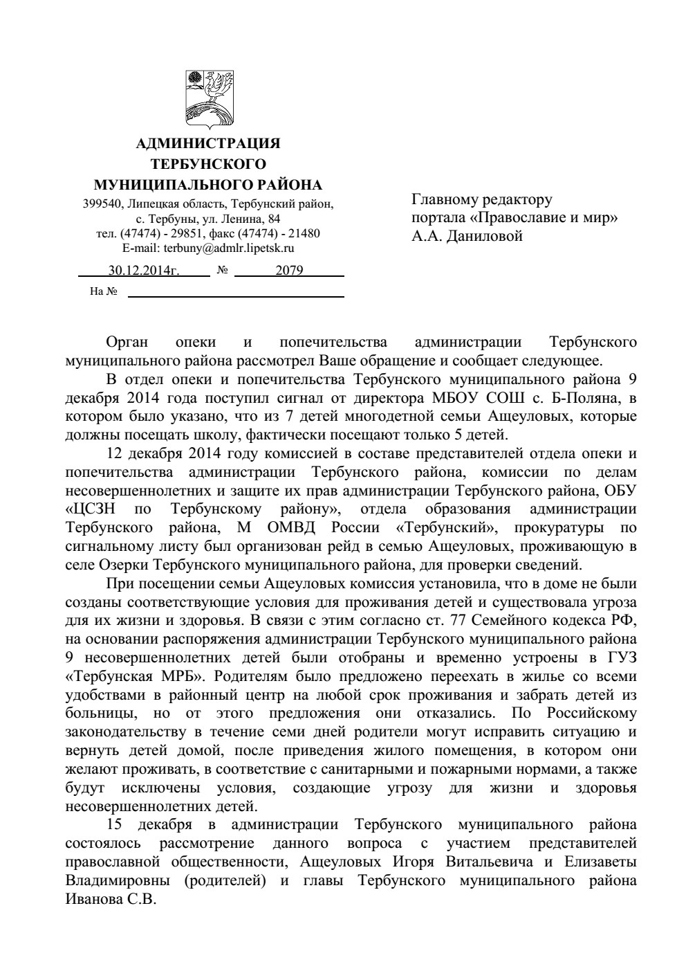 Официальный ответ отдела опеки Тербунского района на запрос «Правмира»: