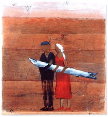 Каждая работа (на двери буфета, кровельном железе, досках) – счастливая пара. «Душа и тело», «Катя и Карен», «Галя и Эдик обедают», «Нефть и газ», «Время и Деньги», «Леля и Дима», «Даша и Володя», «Ларионов и Гончарова», «Мама и Папа». Два голубка, две варежки, отец Павел Груздев и его келейница Мария, две девочки-двойняшки со скрипочками. И счастье их не в том, что они обязательно счастливы бурно и ярко, а в том, что они навсегда вместе, и судьба у них общая. В этой общности и спрятана тайна их счастья.
