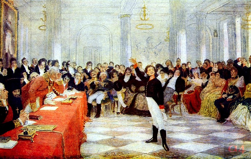 …Этот эпизод вспоминали многие. К столетию Лицея Илья Репин написал одну из самых известных «литературных» картин: «Пушкин на лицейском экзамене». Фигура Державина у Репина излучает ту самую «живость необыкновенную». Сколько бы Державин ни говорил, что литература — это пустяки и баловство, а главное — насаждение законов, исправление нравов, управленческие успехи, но глаза его загорались, когда речь заходила о литературе.