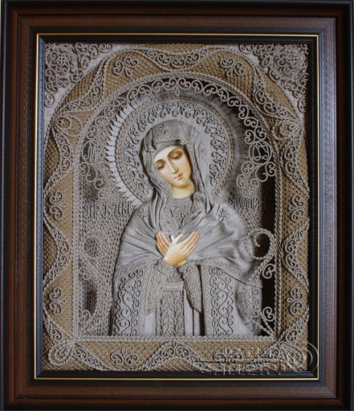 Работы же у Владимира Анатольевича действительно необычные. Традиционно икона всегда считалась богословием в красках. Красок в иконах, созданных мастером, – наперечет. Больше того, в его работах преобладает серый цвет. Серый цвет и у их окладов, а ведь на эти самые оклады всегда были богаты на золото. И вот, поди-же, ты, кружелиха, метель узоров, их вязь из льняной нитки затмевает золото, как затмевает ситец родных небес небеса, пусть синее и ярче, но чужие.