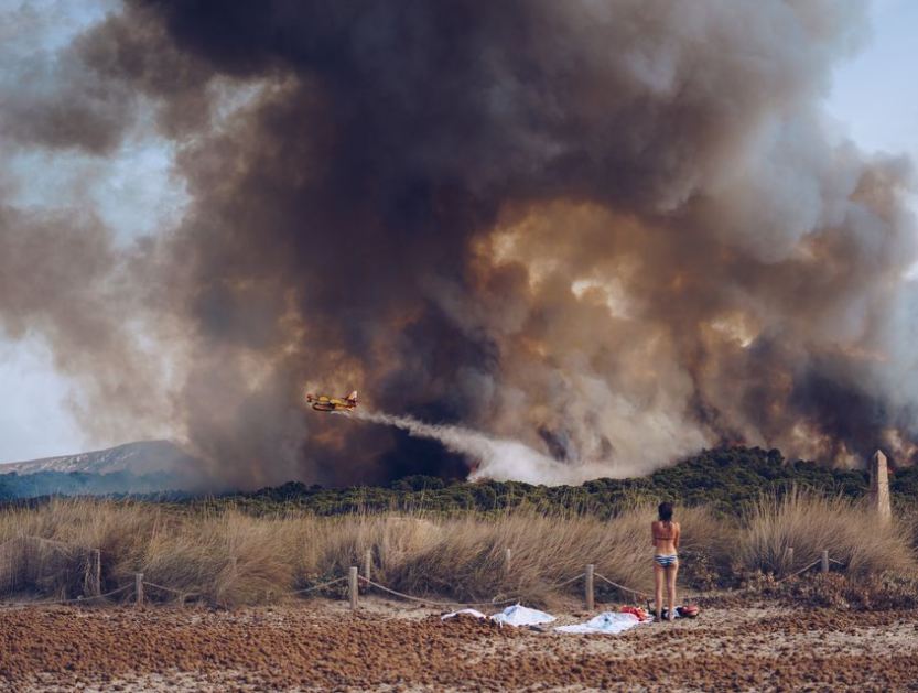 Молодая женщина в бикини смотрит на приближающийся лесной пожар. Пожарный самолет сбрасывает воду, чтобы потушить пламя. Снимок сделан на пляже Сон Сьерра, остров Майорка 18 августа 2016 года.