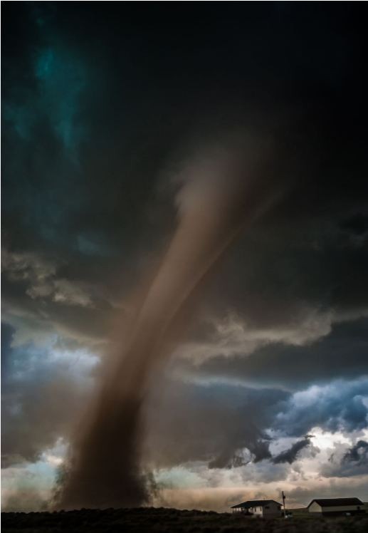 Торнадо EF2 надвигается на дом в городке Рей, Колорадо. Как только мы оказались в безопасности, торнадо пронесся через поле. Мы кинулись вверх по холму, чтобы проверить живы ли жители дома. К счастью, все было в порядке.