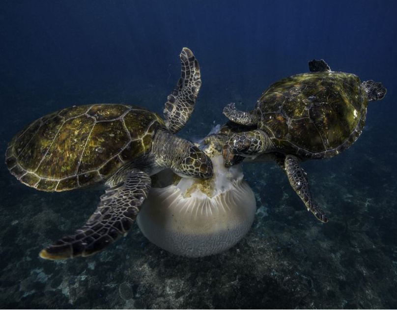 Зеленые черепахи у берегов Австралии пируют, пожирая мягкие щупальца большой медузы.