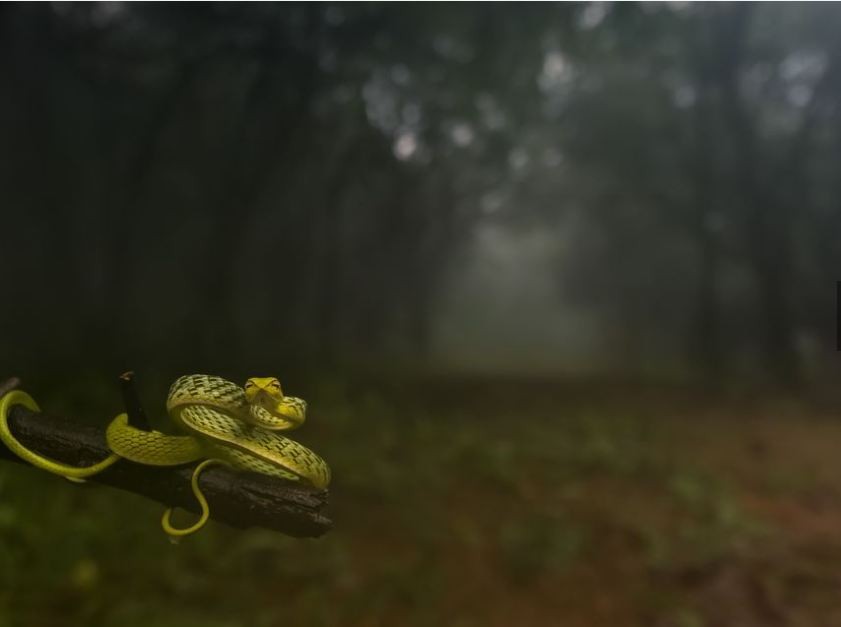 Утренняя прогулка по райскому лесу! Непрерывно моросящий дождь продолжался 12 часов; из-за полумрака смешались день и ночь. Сильный туман, леденящий ветер и вечная тишина смогли успокоить духов; и я увидел ее — 20-ти сантиметровую блестящую остроголовую зеленую змею! Мне повезло увидеть ее в естественной среде обитания. Я сразу же поменял макро-объектив на широкоугольник.