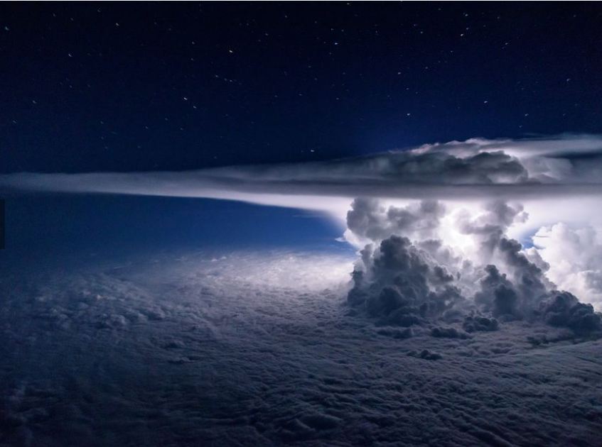 Колоссальный массив кучево-дождевых облаков над Тихим океаном освещается вспышками молний, мы облетаем их на высоте 37000 футов на пути в Южную Америку.
