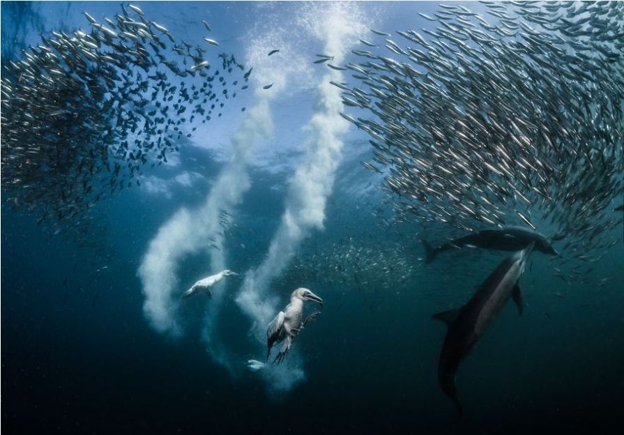 Я сделал этот снимок во время миграции сардин вдоль дикого побережья Южной Африки. На сардин охотятся дельфины-бабочки и бакланы. Охоту начинают дельфины, которые разработали свои методы охоты. Бакланы – обладатели прекрасного зрения – следят за дельфинами, а затем ныряют в воду с 30-40-метровой высоты со скоростью 80 км/ч, чтобы поймать сардин.