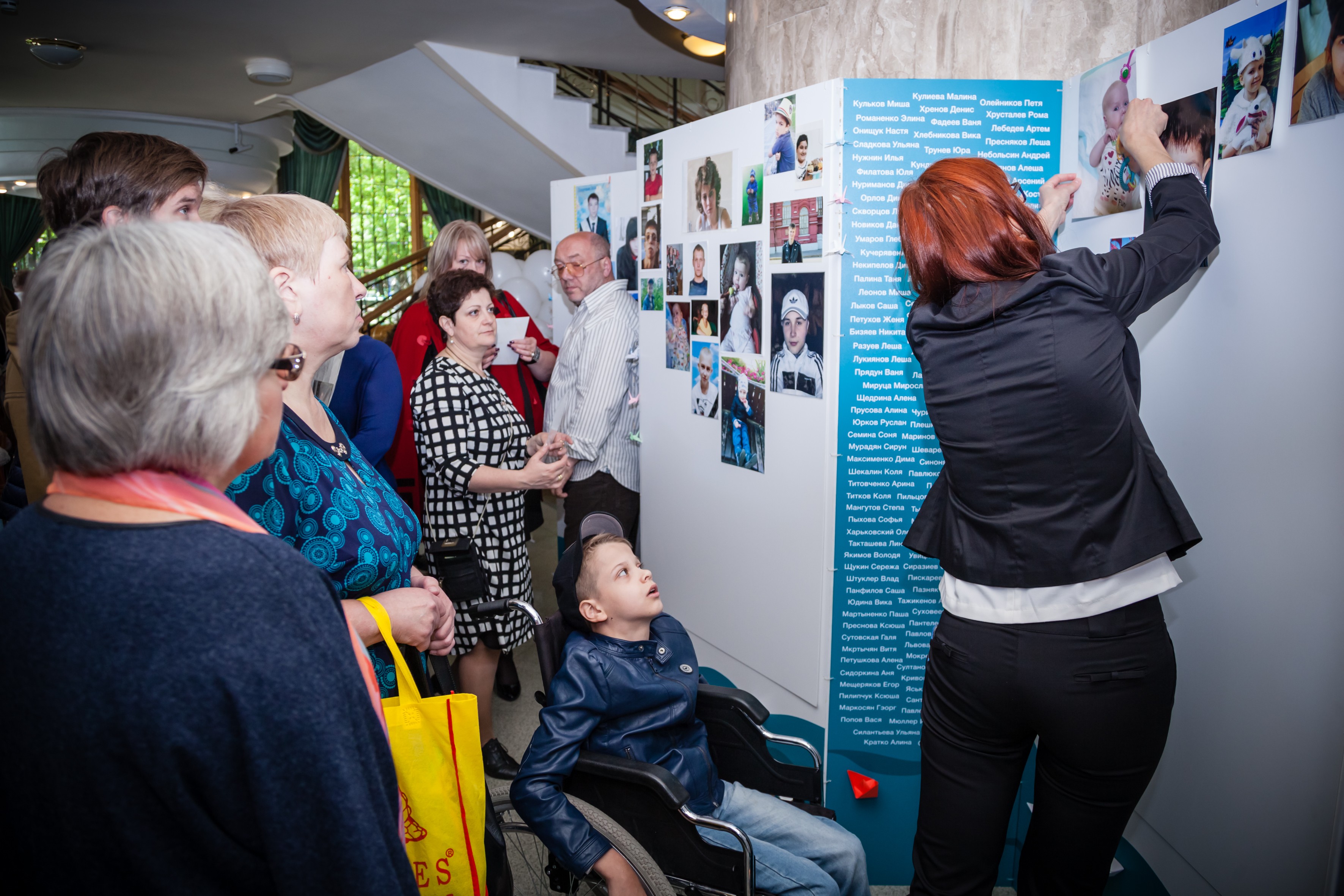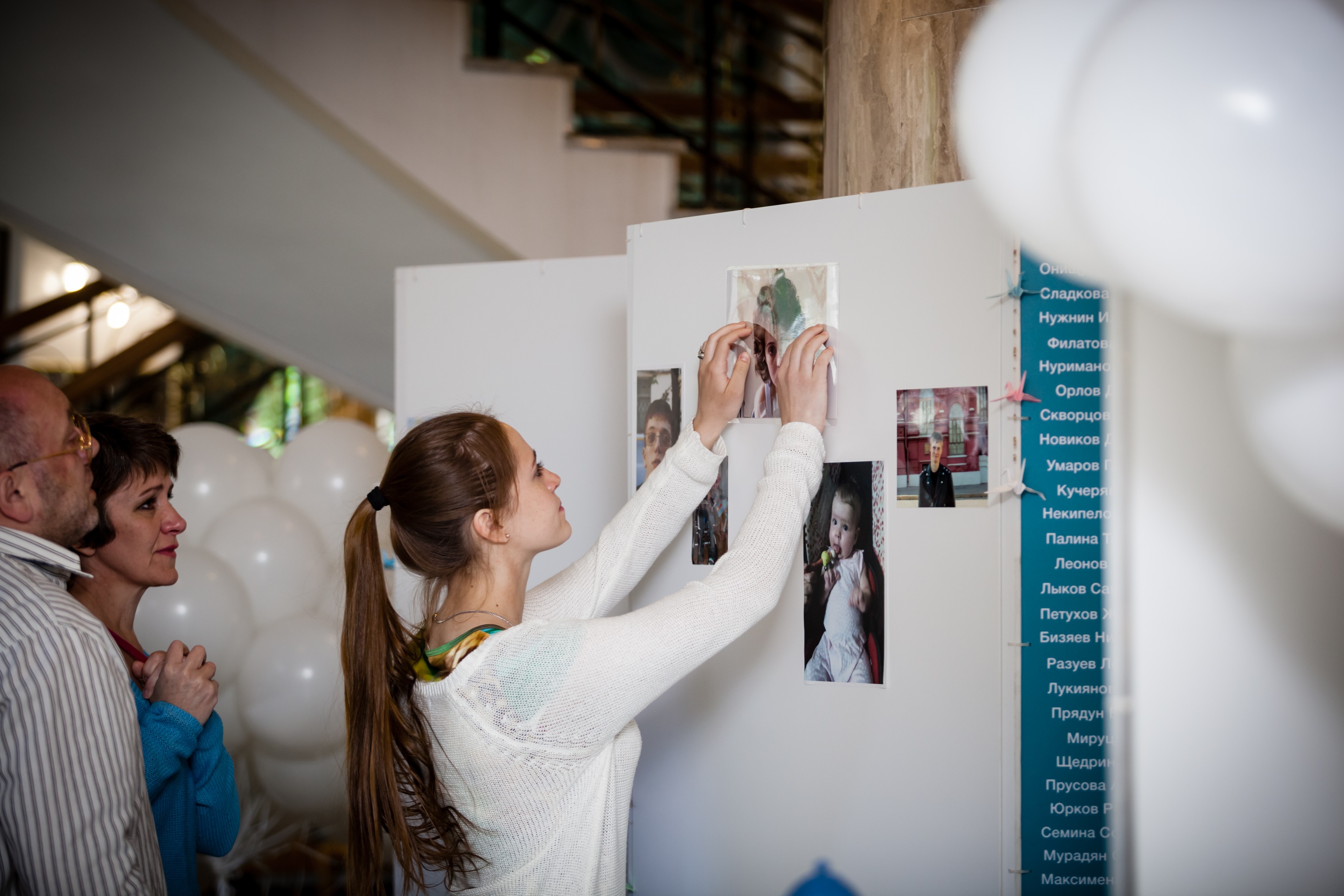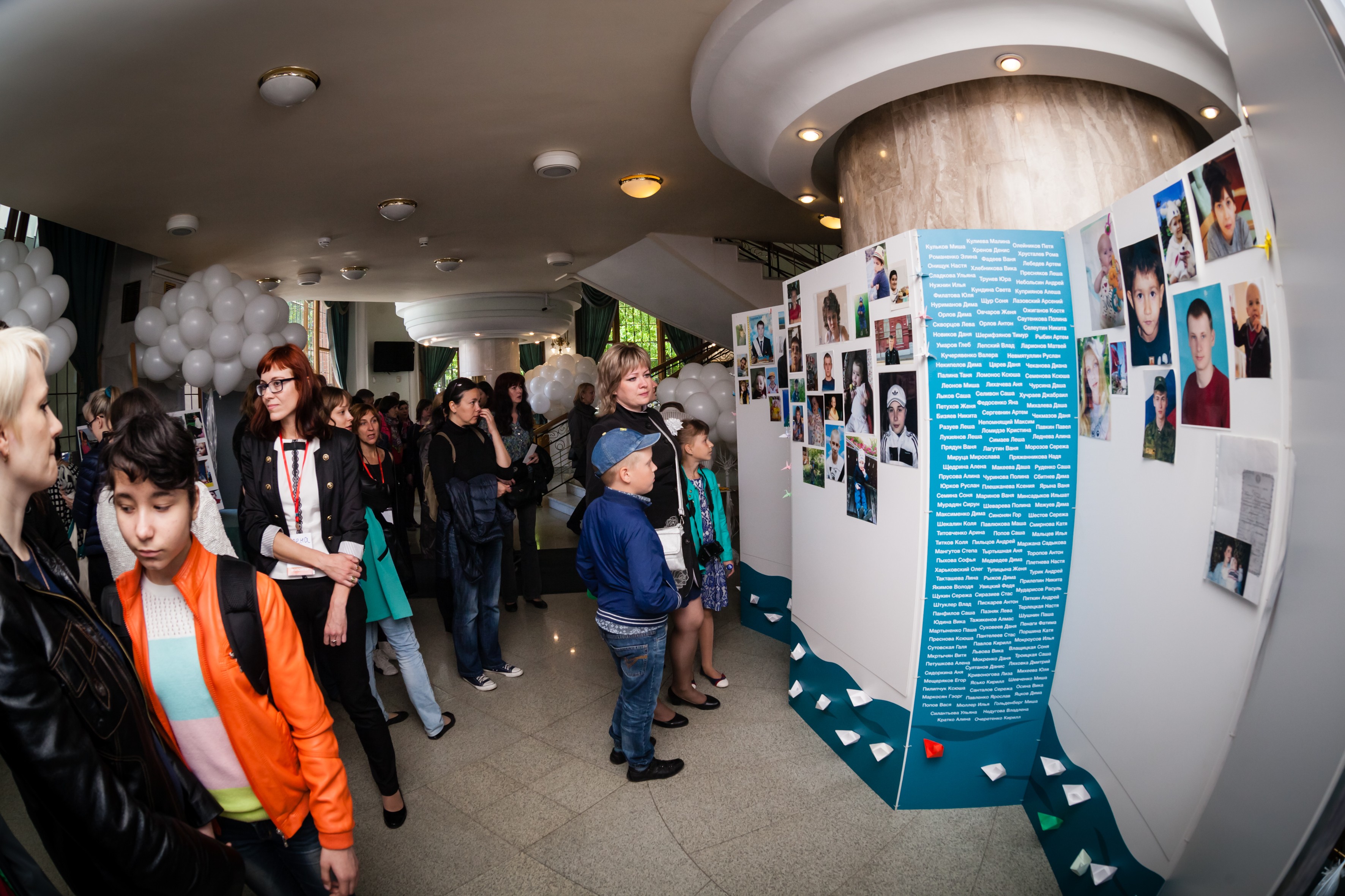 В здании театра Новая опера много людей и … очень тихо. Только дети бегают, шумят и смеются, и на этот смех отзываются улыбками их ушедшие братья и сестры с фотографий на стендах. Эти фотографии бережно приклеивают молчаливые родители — беременная плачущая девушка, молодая семья с грудным ребенком, пожилая пара…