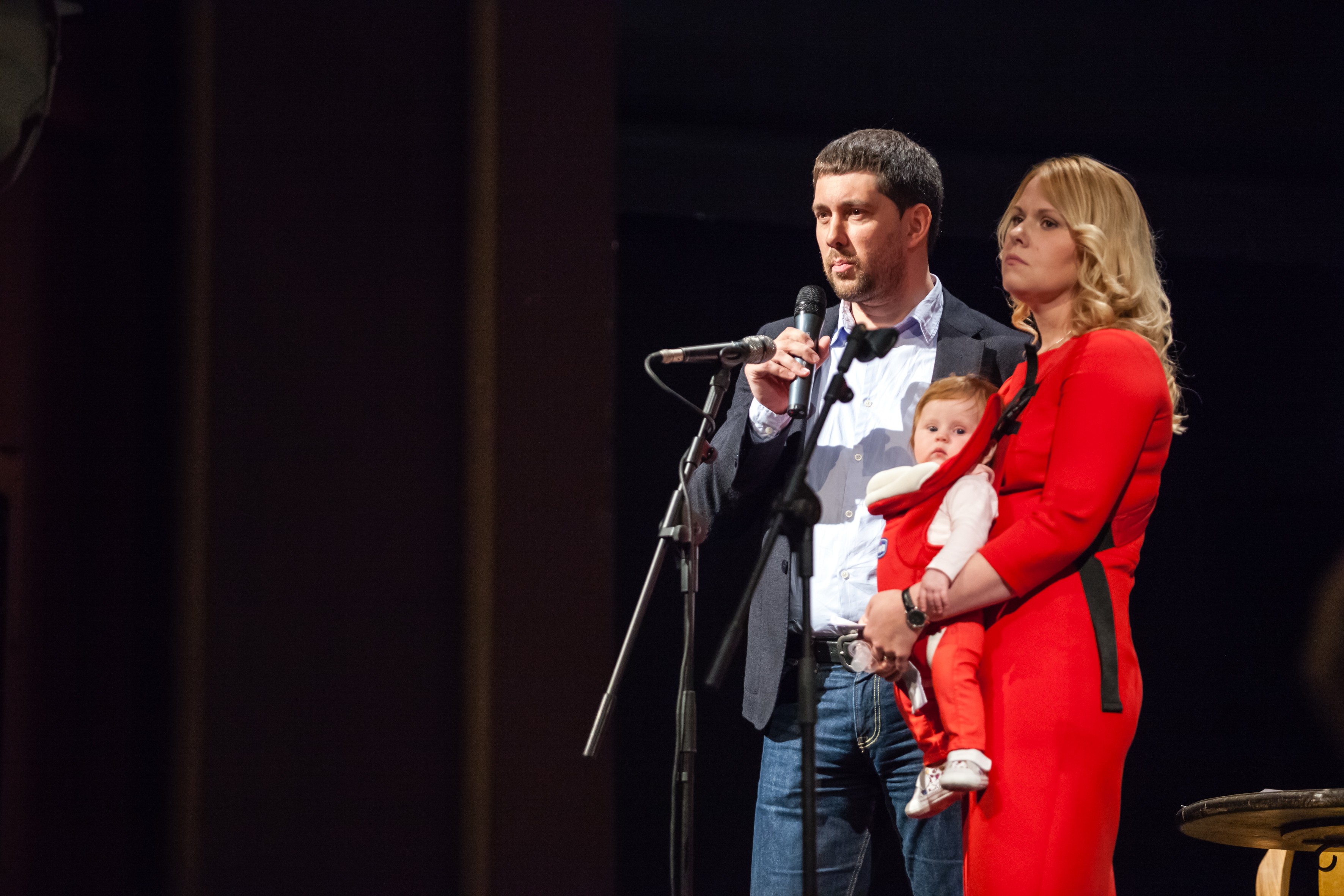 Так, папа Дани Александр, который в прошлом году сквозь слезы делился радостью — они с женой ждут ребенка! — сегодня поднялся на сцену вместе с женой и веселой девочкой, скачущей в слинге на руках у мамы.