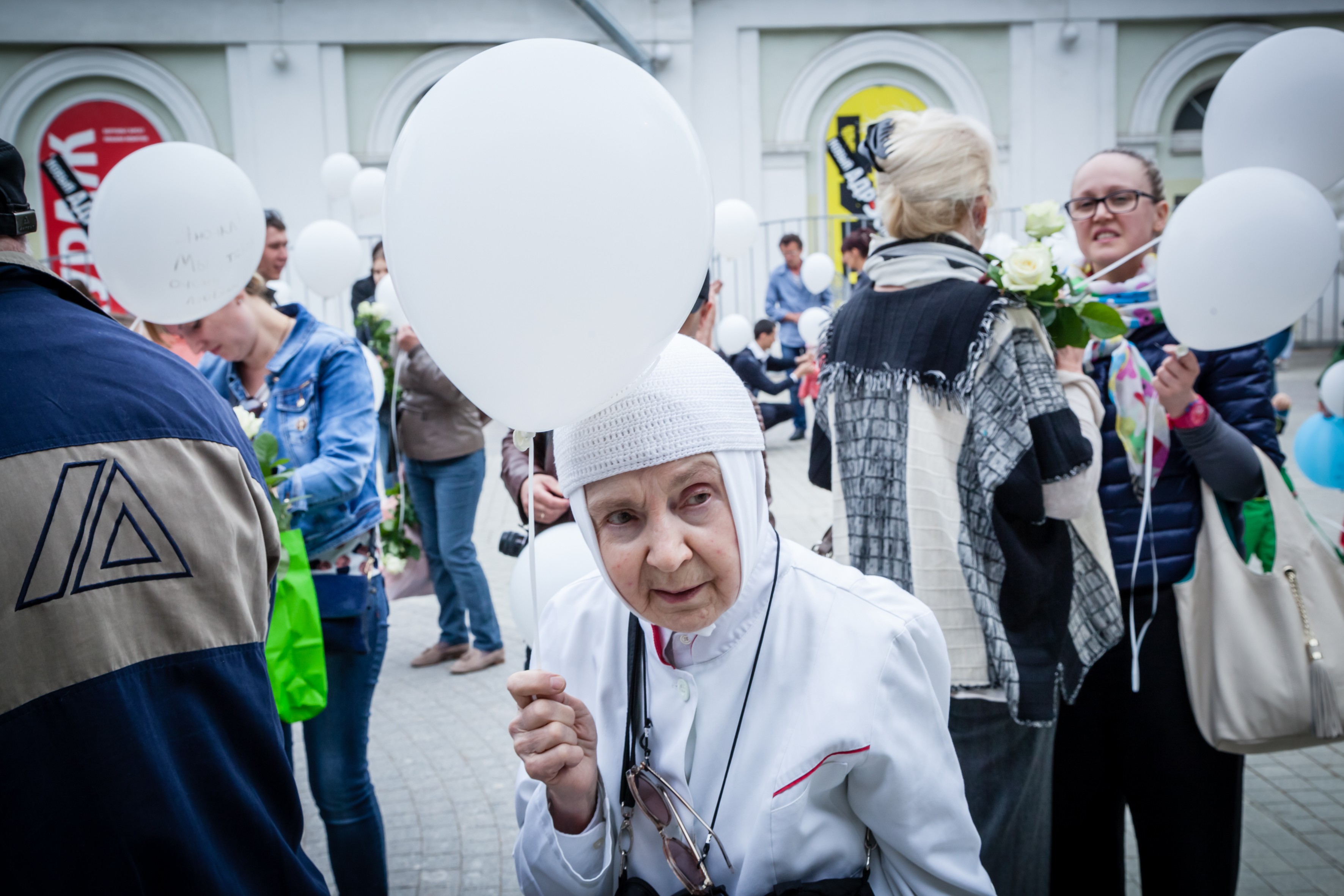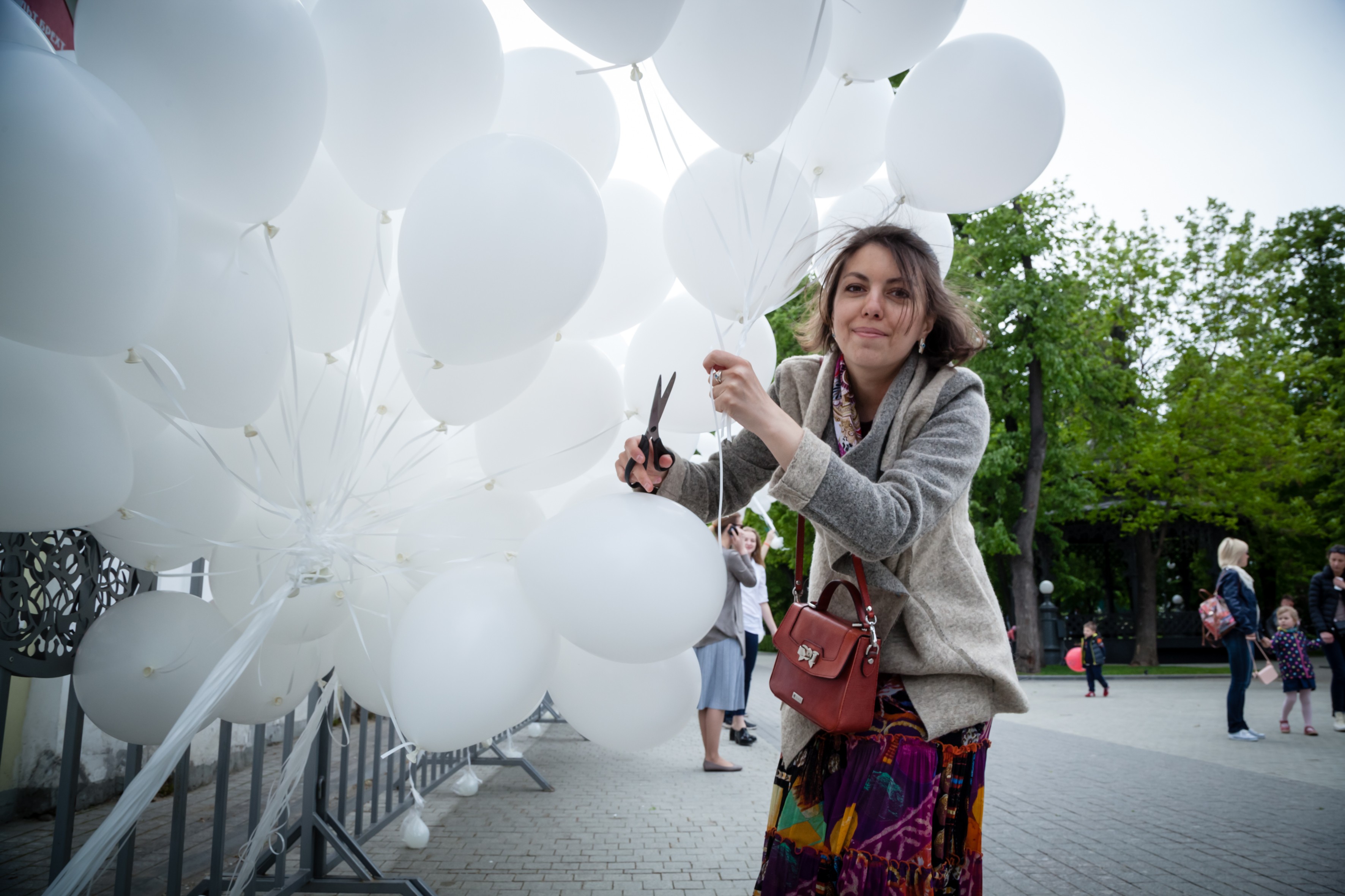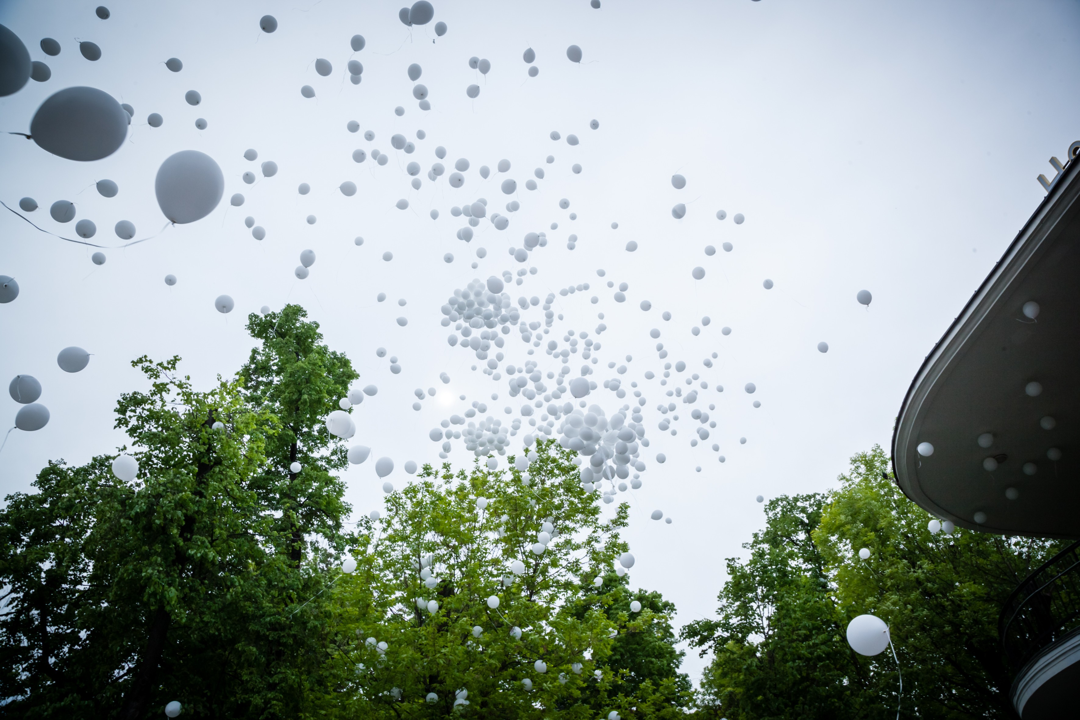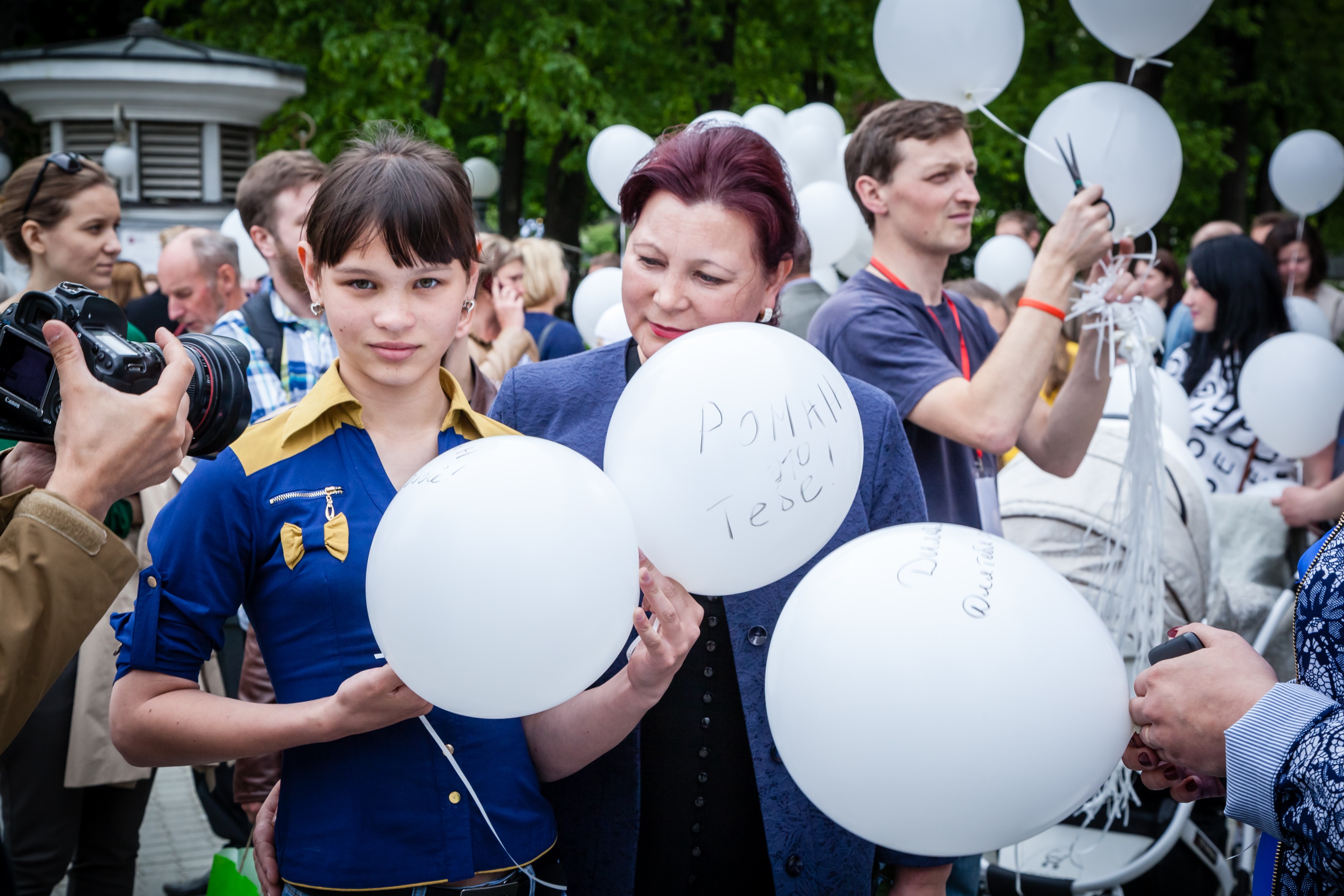 И вот на улице родителям снова раздали сотни белых воздушных шаров. Дул сильный ветер, шары рвались в небо. И, не дожидаясь общей команды, некоторые родители были вынуждены выпустить невесомую веревку с шариком из рук, чтобы дать ему улететь.