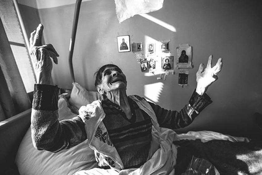 — А ведь они чьи-то дети, которые век назад беззаботно смеялись на руках у своих отцов. Какая доля им досталась в жизни… Война и такая старость, — пишет автор фото. — На одном этаже спрашиваю: «Есть ветераны?» — вон в той палате бабушка умирает. И персонал — люди вроде не злые, обычные, а есть и явно хорошие. И не сказать, что безразличие, все в порядке. Но не должен быть порядок таким… Хотя посмотрите в их глаза: надежда, кокетливость, озорство, мечтательность, часто сквозь слезы, и главное — желание, чтобы помнили и любили.