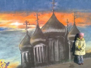 И точно. Среди пёстрых рисунков граффити, щедро раскиданных по стене в районе нижнего Горизонта, вдруг он – Свято-Троицкий Собор.