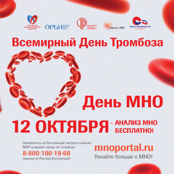 13 октября отмечается Всемирный день тромбоза. К этой дате Российское кардиологическое общество проводит акцию «День МНО» — пациенты, принимающие непрямые антикоагулянты, в 25 городах смогут бесплатно проверить уровень свертываемости крови.