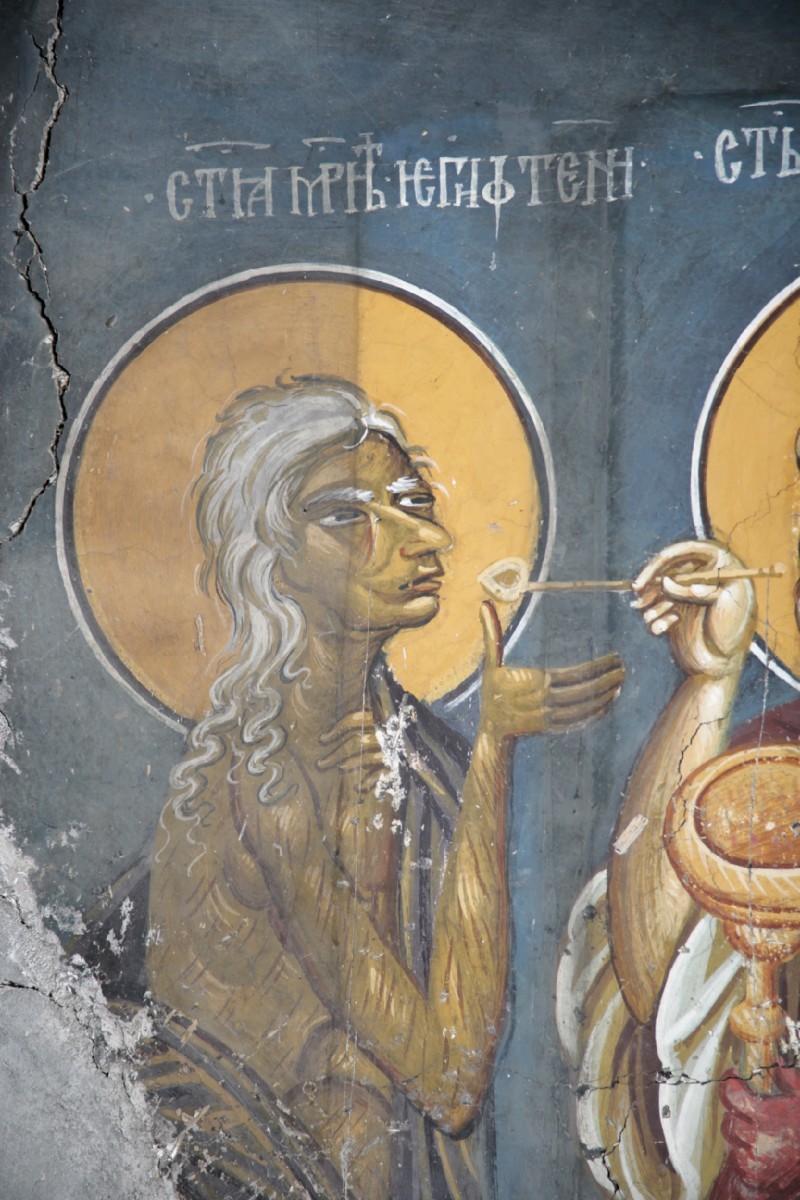 Сияющий, полный красок Зосима-иерей стоит с Чашей, полной Святых Таин Тела и Крови Христа Бога. Зосима прекрасен. И ризы его, и фон позади него повторяют насыщенные цвета риз Христа – синий и алый. Словно Христос Бог себя явил в том, кто трепетал перед подвигом смиренной пустынницы Марии, кто в полной мере осознал своё недостоинство перед её деланием и смирением. Но нашему взору теперь в некоторой степени открывается то, что узрела Мария-пустынница, в своих выцветших ризах стоящая перед ним – «Ты – иерей и несёшь Святые Дары!» — говорит она, предупреждая его падение ниц перед нею. И теперь понятно, что это – не смиреннословие, не рисовка. Мария видит «умным оком», «очами духа», просветленными постом и подвигом, что грядёт к ней Тот, кто выше и Зосимы, и её самой – какая бы пропасть духовная не разделяла её от Зосимы и её саму от прежней александрийской Марии-блудницы.