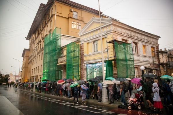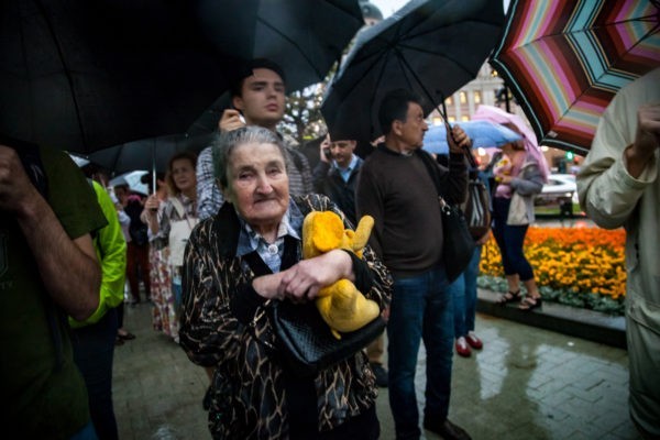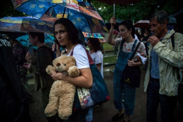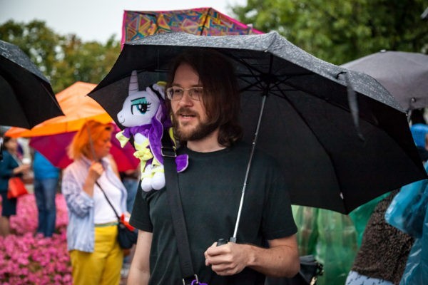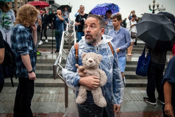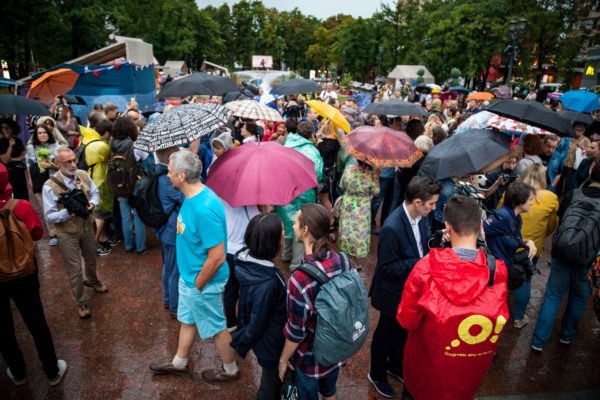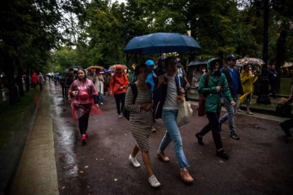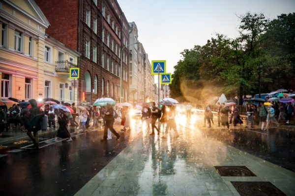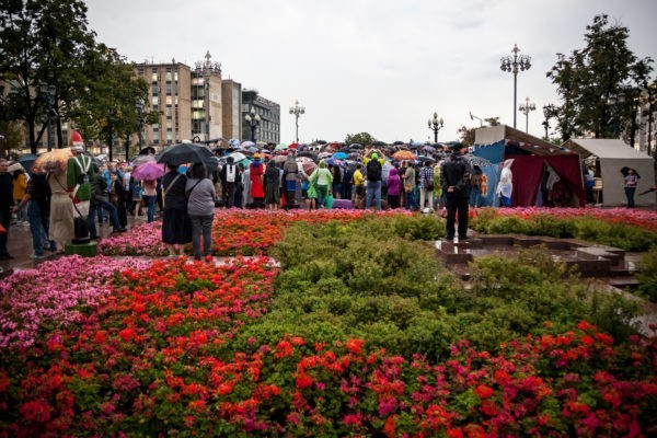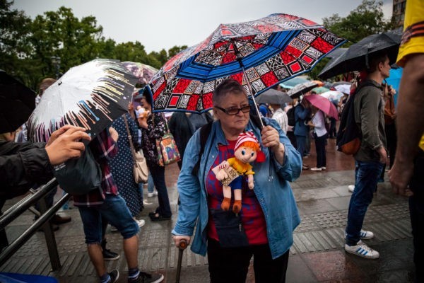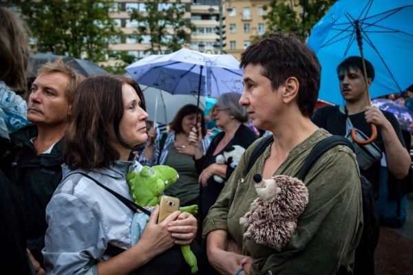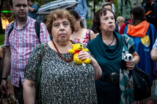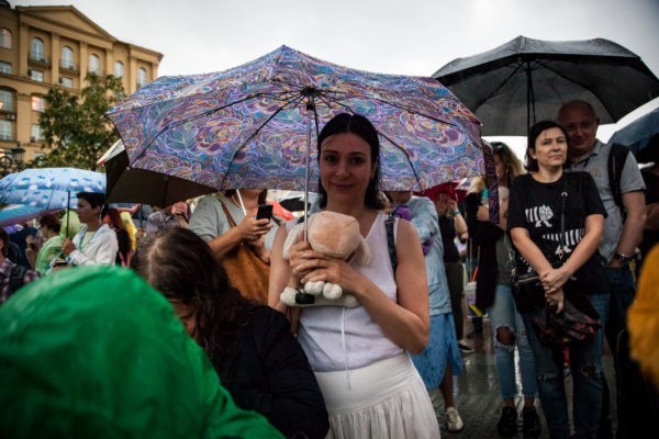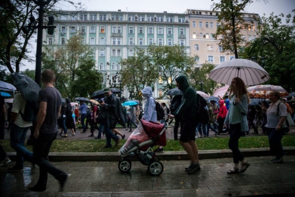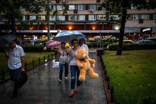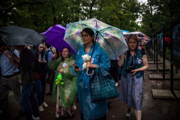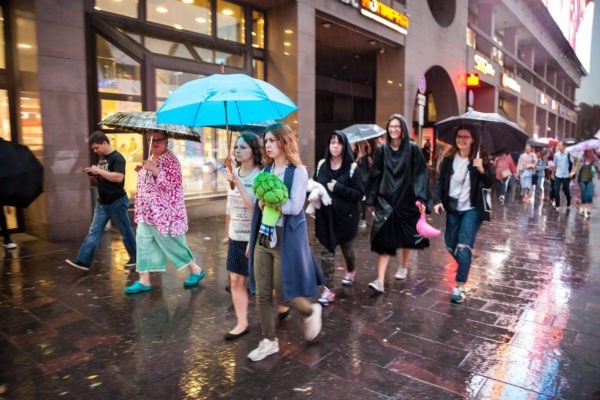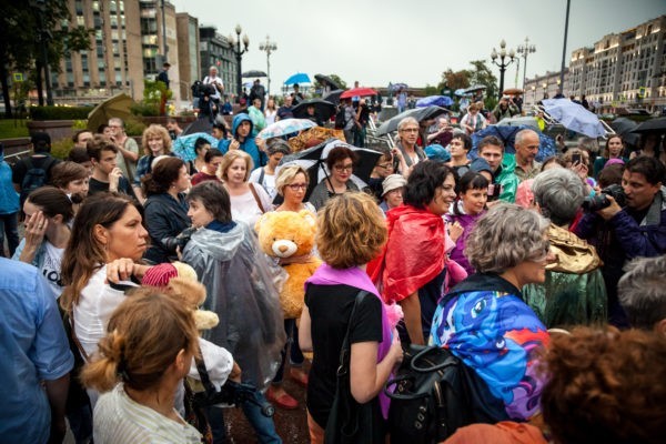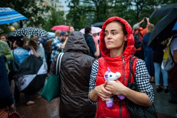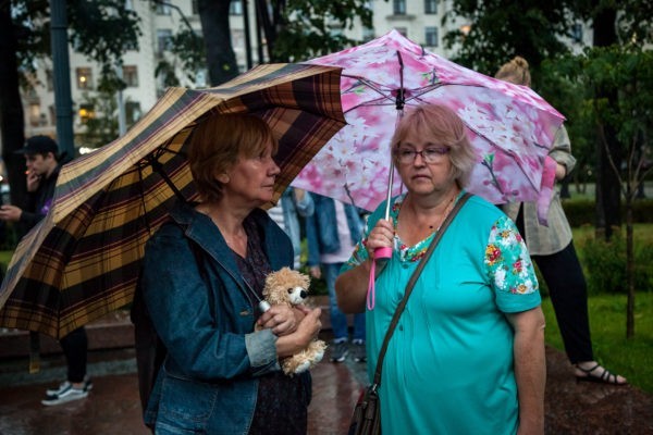 19.05 Несмотря на проливной дождь и грозу, люди — всего около 1000 человек — двинулись от Новопушкинского сквера к Тверскому бульвару. Большая часть действительно женщины, много пожилых людей и подростков. В руках — мягкие игрушки, куклы Барби, правда, за зонтиками их не разглядеть. Люди идут мирно, многие семьями или с друзьями. Разговаривают, фотографируются. Полиции нет, политических лозунгов тоже.