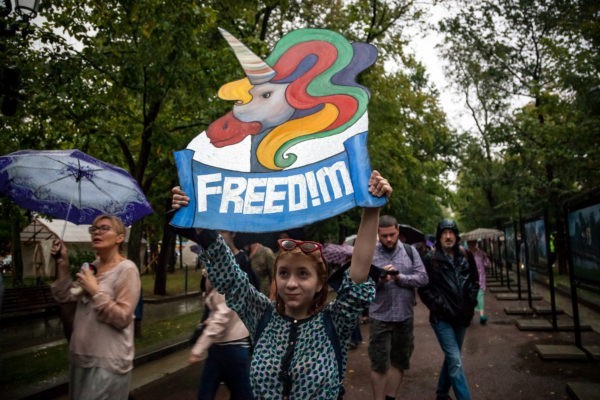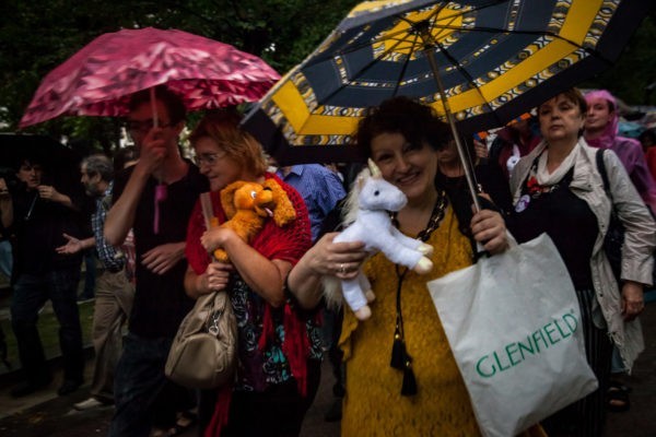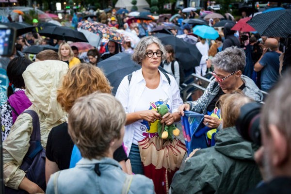 19.25 Женщины идут с мягкими игрушками или значками с изображением единорога. А вот мужчины, похоже, отказались от идеи прийти в майках с надписью «мать», зато есть по крайней мере один с «уточкой» протеста.