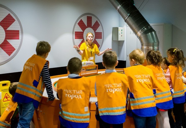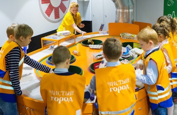 Наставница высыпает на ленту кучу мусора – банки, пластиковые бутылочки, бумажки. «Все знают, как выглядит железо? Правильно! Оно тяжелое и блестит! Итак, сюда железо, сюда – пластик, сюда – бумага», – раздает она последние инструкции и включает транспортер. Мусорная куча движется по кругу, и ребята, вопя от восторга, сортируют мусор, швыряя его в разные бачки.