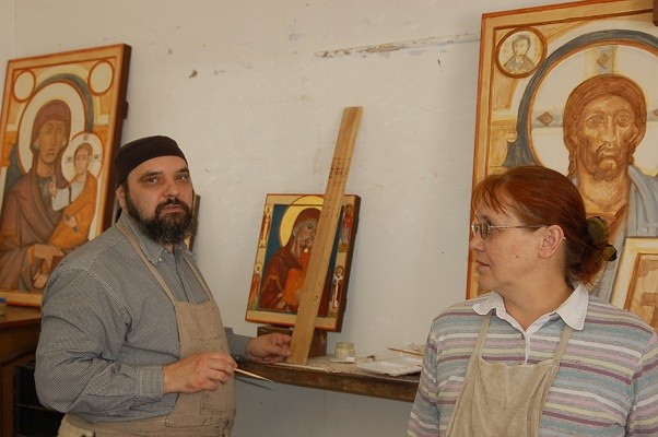 Отец Андрей – за мольбертом. Марина вышивает и рассказывает.