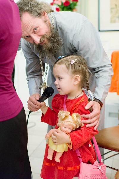 «Готовя этот вечер, мы с матушкой решили говорить не столько о самой книге, хотя не говорить о ней невозможно, поскольку ее „составители“ — наши дети, наша семья. Мы хотели показать жизнь нашей семьи, поделиться радостью, теплотой, которая, мы дерзаем думать, есть в нашем доме. Мы хотим, чтобы вам стало тепло и радостно», — обратился к гостям отец Андрей в самом начале встречи.
