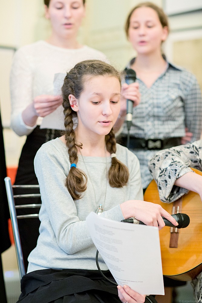 У собравшихся в центре «Покровские ворота» была возможность «побывать» на некоторых из этих концертов и конкурсов, с помощью показа архивных домашних видеозаписей. Вот конкурс на лучшую декламацию. Дети должны были сами выбрать стихотворение, подобрать музыку, костюмы. Все участники конкурса выбрали стихи христианского содержания.