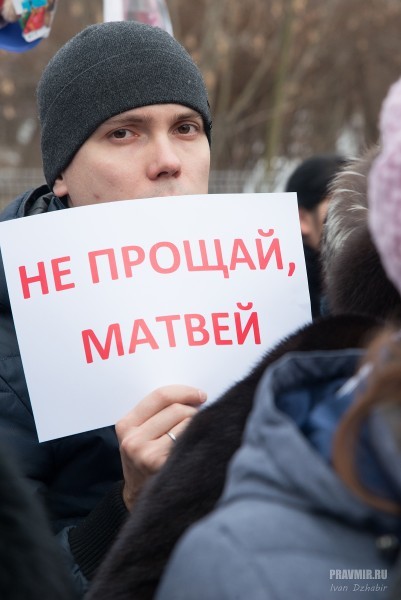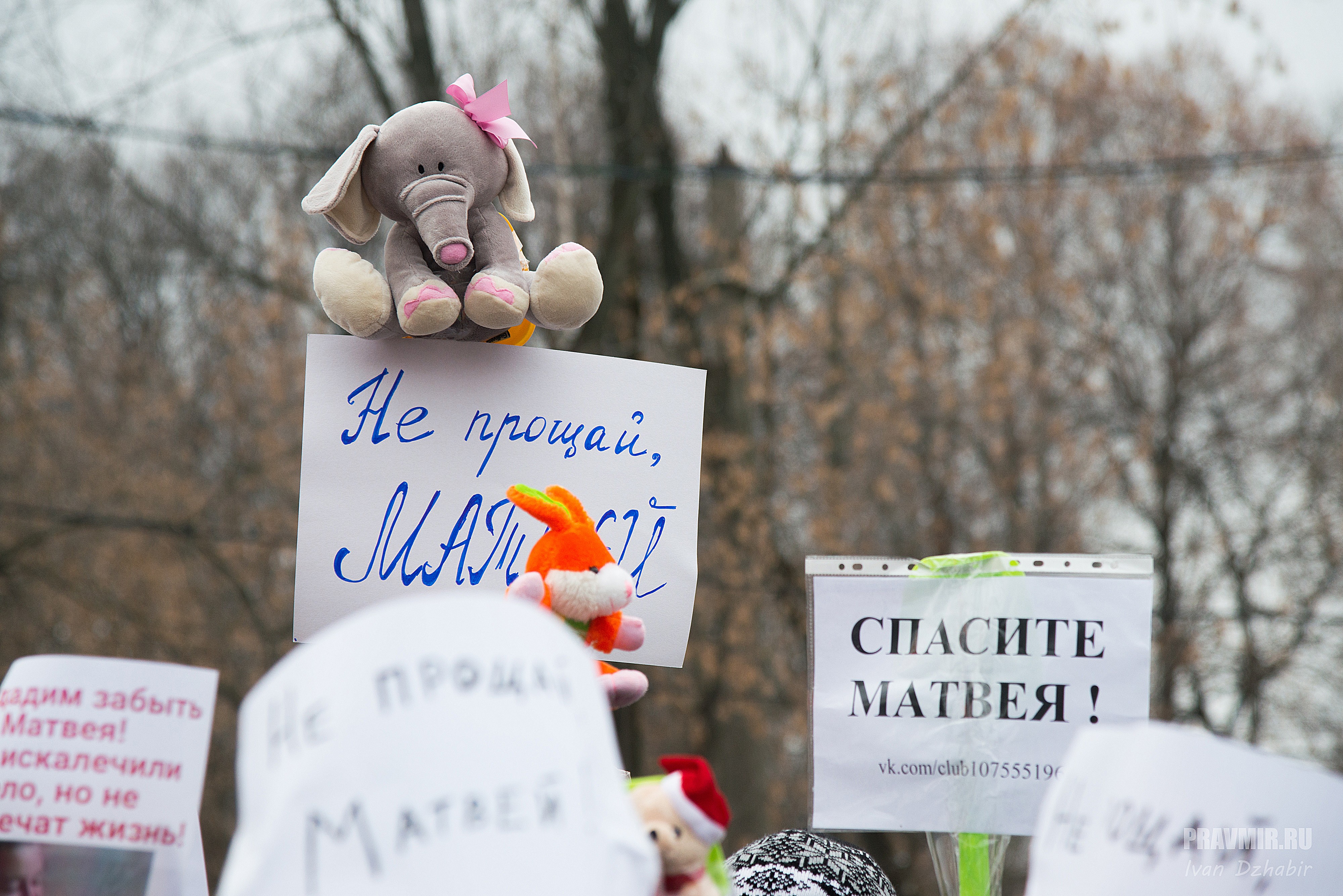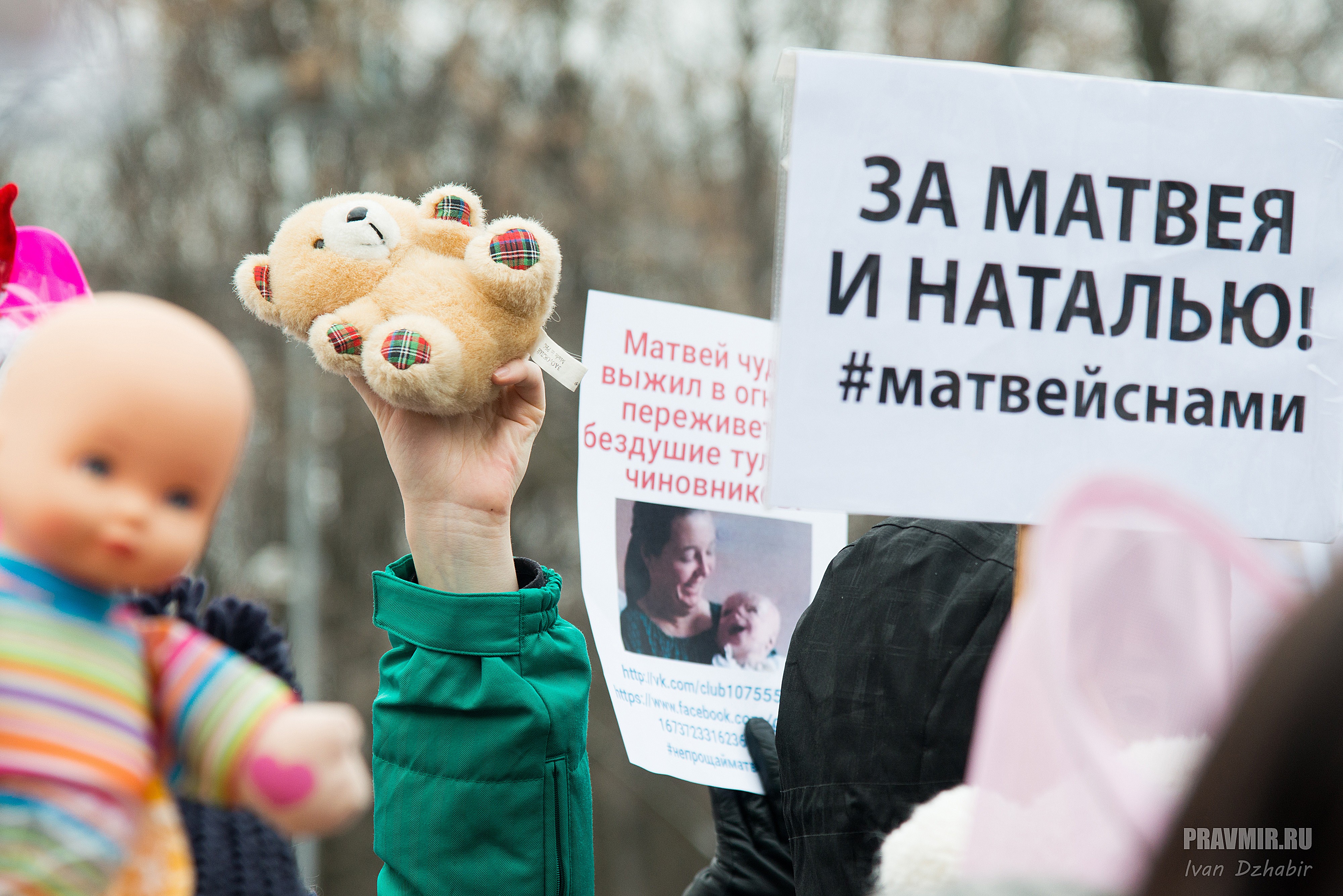 «Матвей чудом выжил в огне, переживет ли он бездушие чиновников?» – гласили плакаты группы девушек, которые пришли на митинг в числе первых. Своих детей у них пока нет, но маленького Матвея как «чужого ребенка» и «чужую беду» они не воспринимают. Одна из них прочитала про мальчика в интернете, другой кто-то бросил листовку в почтовый ящик.