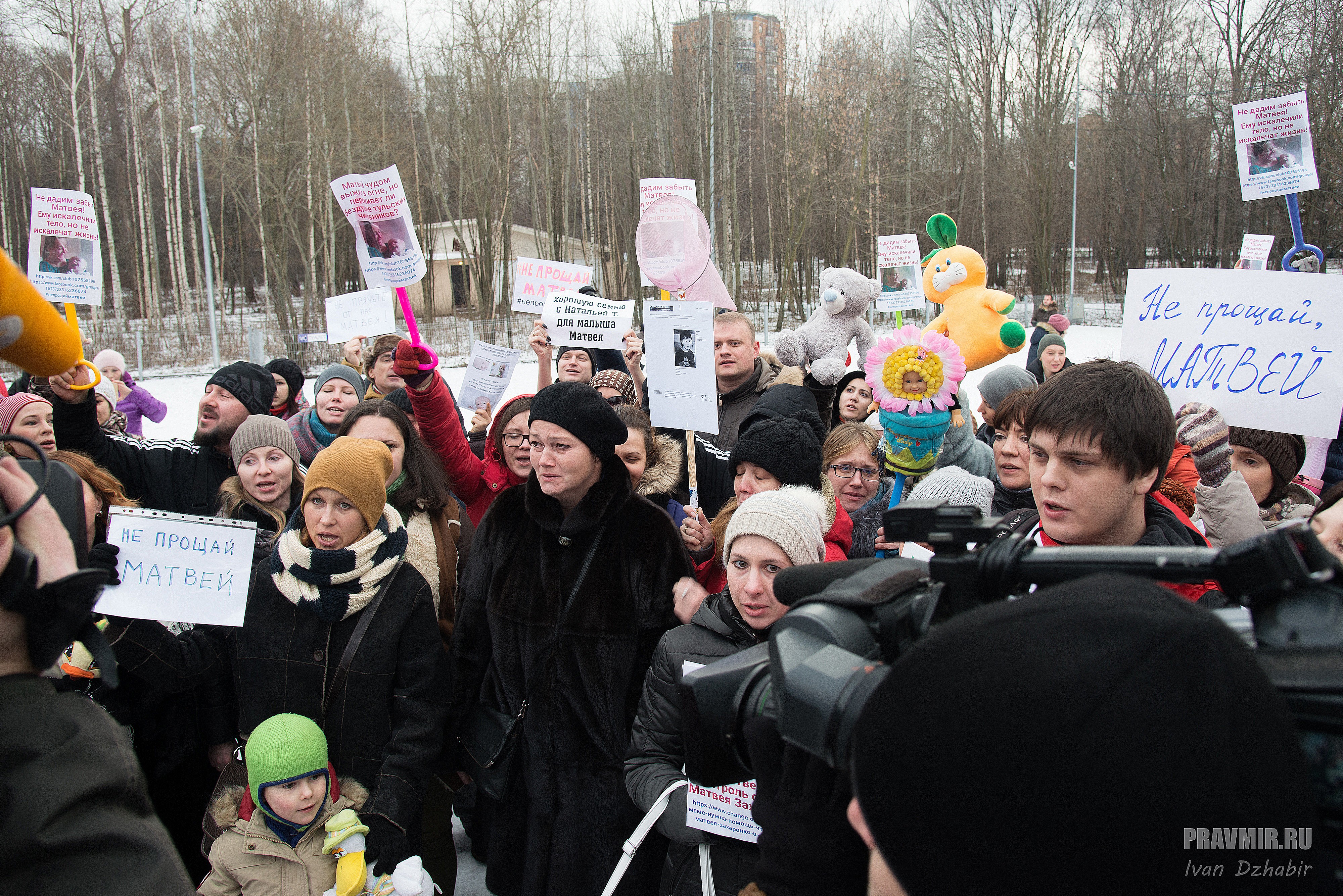 «Матвей, мы с тобой!» – скандировали собравшиеся, поднимая над головой плюшевые игрушки и резиновых пупсов, привязанных к одолженным у собственных малышей на время пластиковым лопаткам.