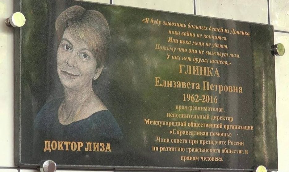 Мемориальная доска установлена на центральном входе детской клинической больницы. С первых дней войны Доктор Лиза оказывала помощь детям и людям Донецкой и Луганской областей, эвакуировав на лечение в Россию более 500 раненых и тяжелобольных детей.