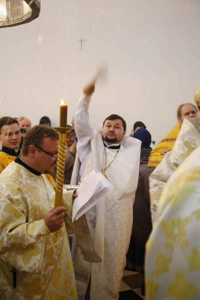 Затем окропляют святой водой и помазывают миром и стены храма. Освящение храма закончено, осталось лишь вложить в его основание мощи.