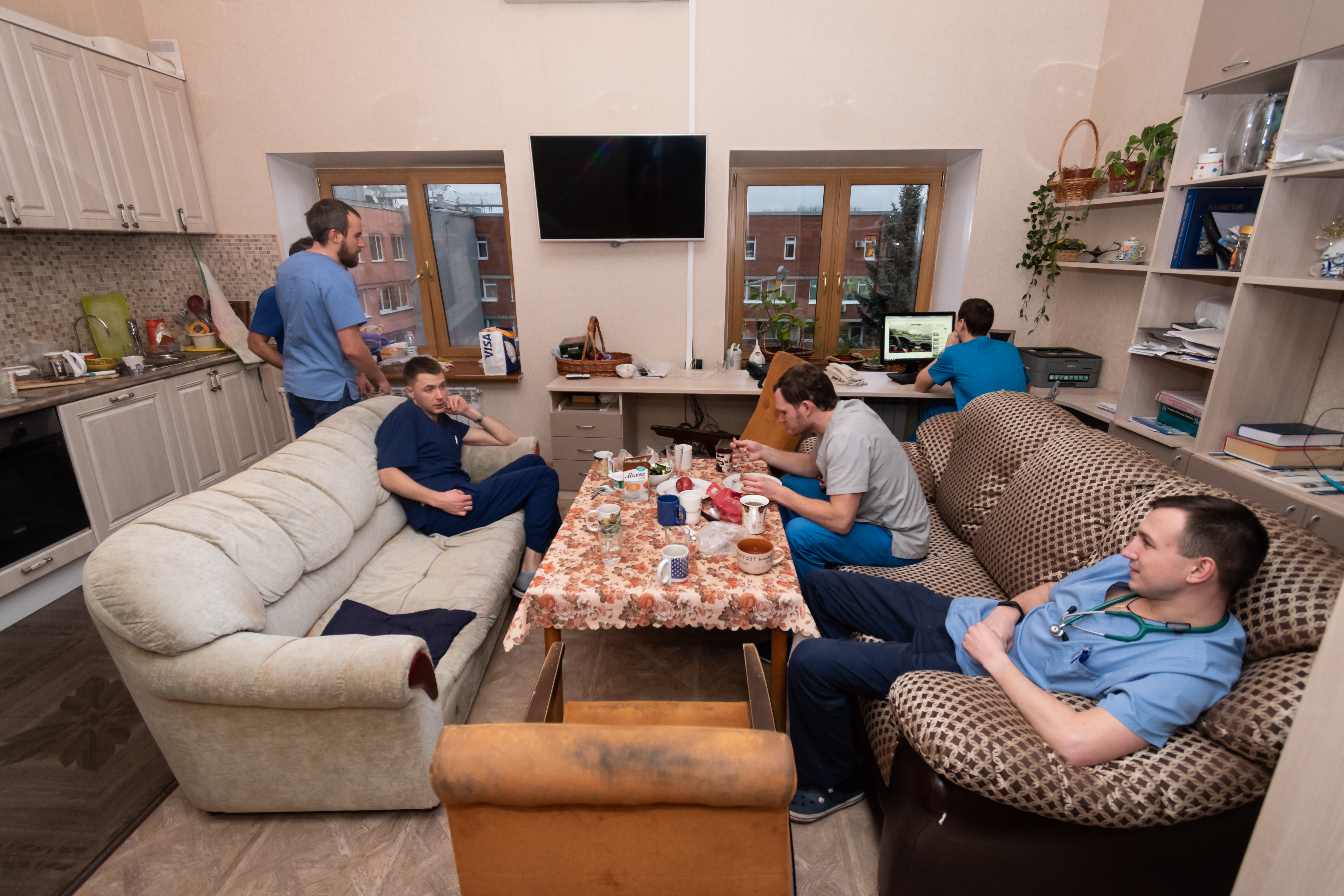 Когда есть время и возможность, врачи отдыхают в ординаторской. Там же, если удается, спят, по полтора-два часа в сутки. Просторная кухня, на которой врачи готовят самостоятельно, удобные диваны, в соседней комнате двухэтажные кровати, как в хостелах. Кто-то читает, кто-то смотрит телевизор. Рядом за дверью маленький спортивный уголок: штанги, гантели.