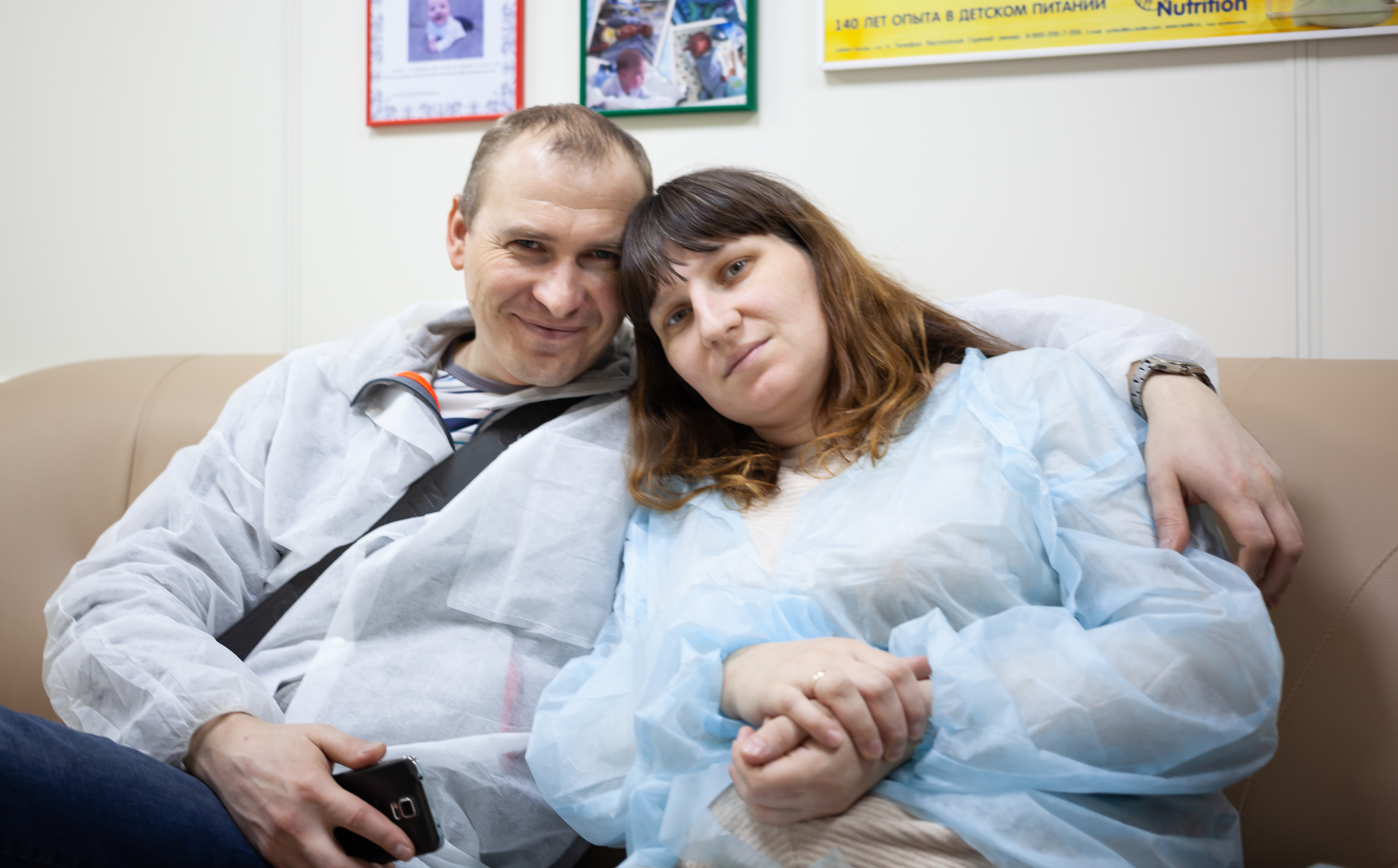 На диване сидит пара, Виталий и Александра. Мама только сегодня выписалась из роддома, сама еще слабенькая. Они уже были у дочки, сейчас присели, чтобы Александра отдохнула. В руке она держит бумажку, на которой указан список документов для оформления на материнское отделение. Приобнимая жену и смущенно улыбаясь, Виталий рассказывает, что врачи его обрадовали: за эти пять дней у девочки сняли один диагноз и «говорят о том, что динамика положительная».