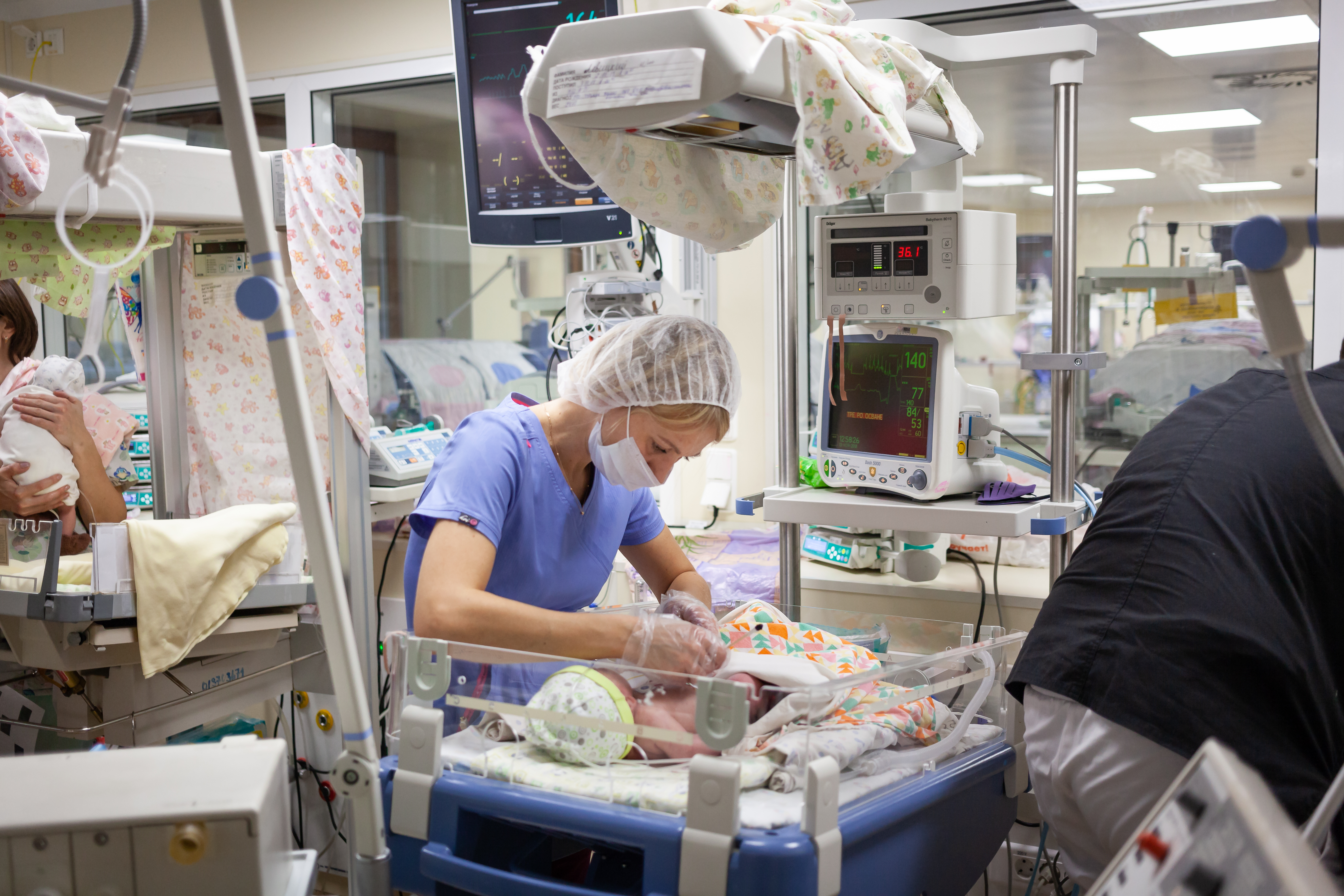 За детьми ведется постоянное наблюдение врачами. Плюс круглосуточно в палате находятся медсестры. У каждой под контролем по три-четыре ребенка. Колоссальная нагрузка: во всем мире на одну медсестру приходится один, максимум два младенца.