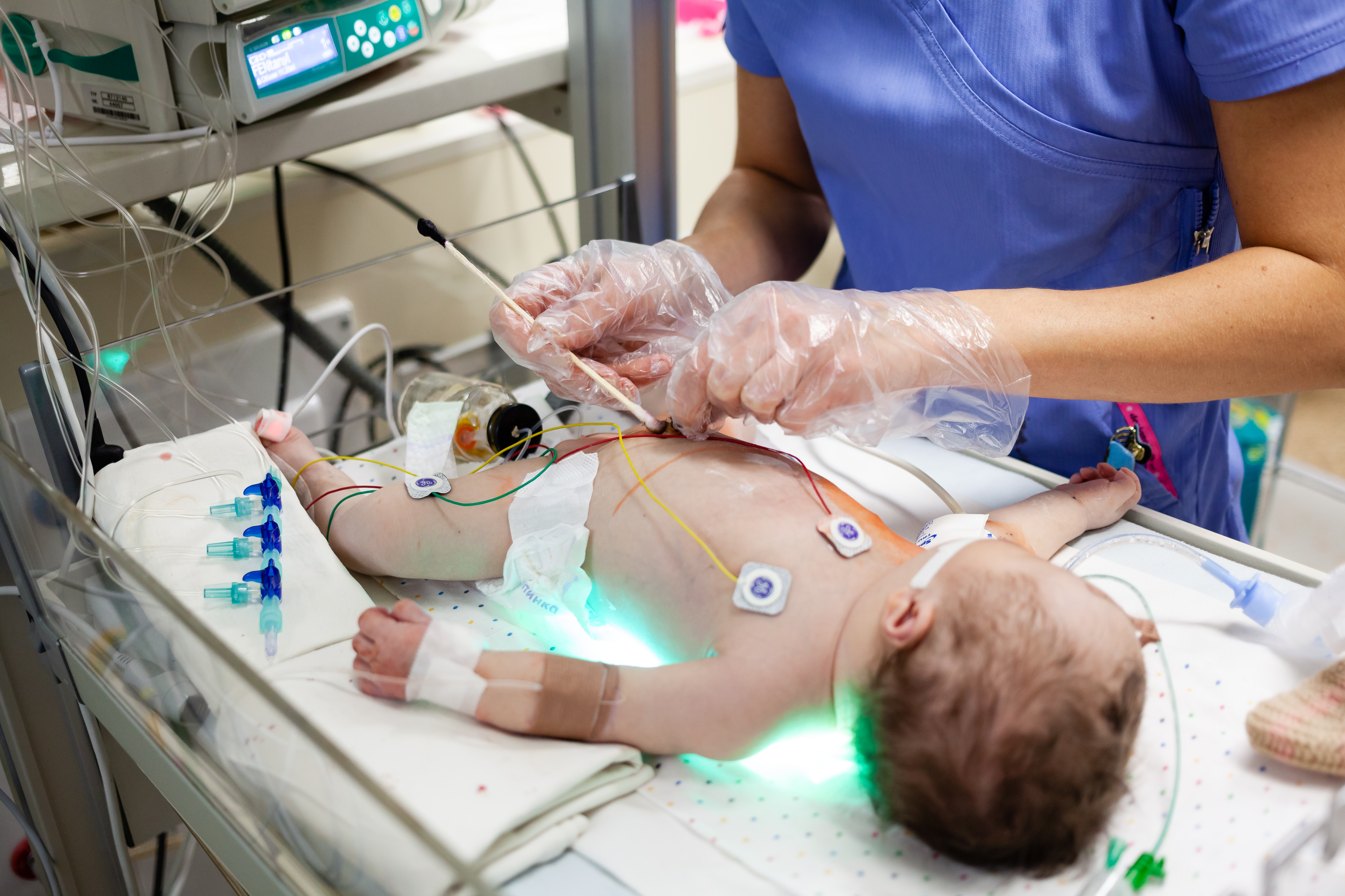Также по часам санация (медсестра убирает слизь из трахеи и верхних дыхательных путей: рта и носа), если не требуется более частого, и перекладывание малышей, чтобы не было пролежней. Один-два раза в день берут кровь на анализы, чтобы точно следить за важными показателями.