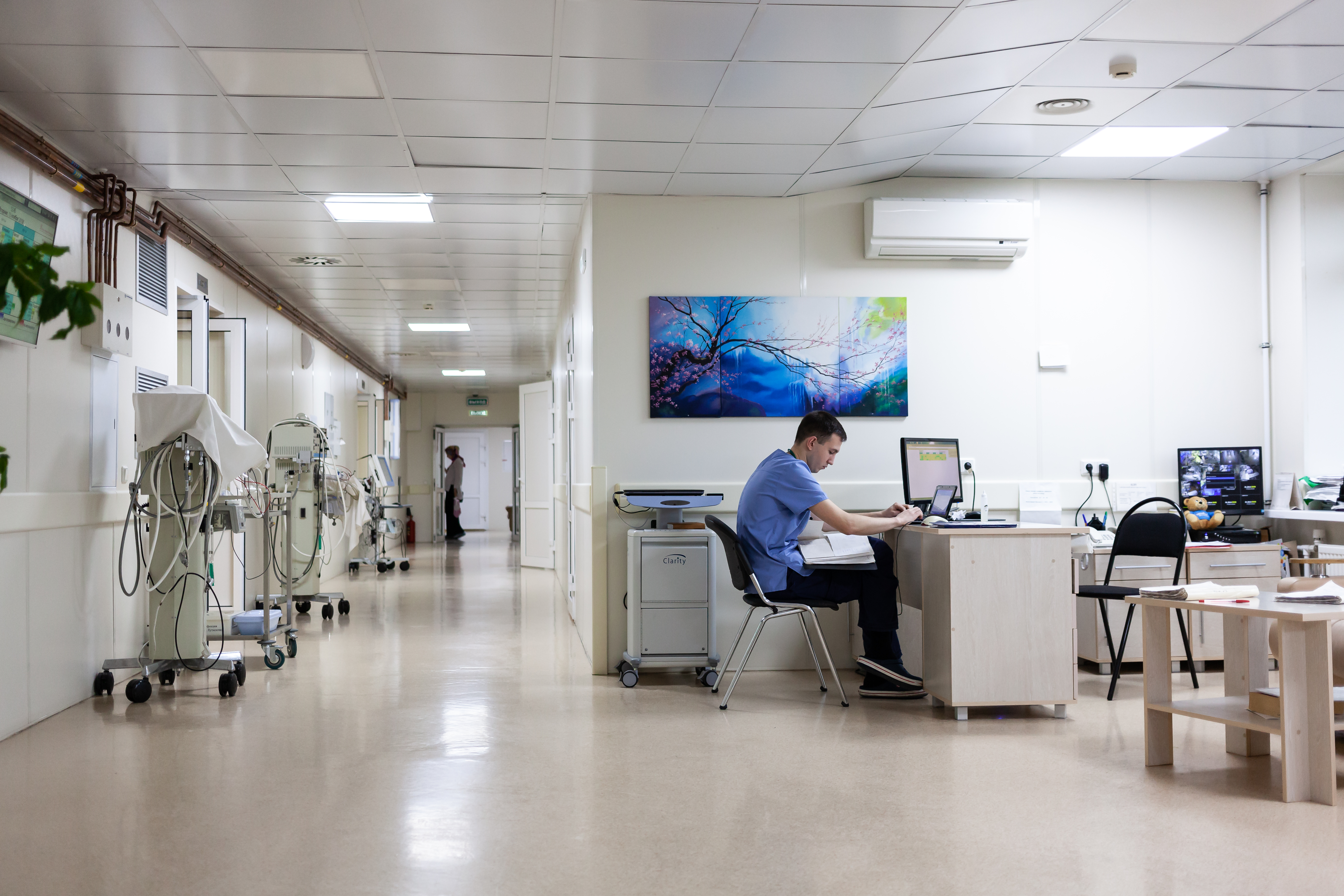 39 отделение — единственная реанимация в России, занимающая два этажа. На каждом из них по четыре поста: огромные комнаты, напичканные сложным оборудованием и кювезами, похожими на мини-МКС: датчики, провода, мониторы с цифрами. Двойные стенки, укрывающие от лишнего шума, индивидуальный температурный режим, микроклимат.