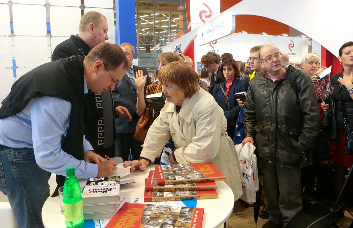 7 сентября в рамках работы Московской международной книжной выставки ярмарки в 75 павильоне ВВЦ издательство «Олма-Медиа групп» представило новое издание книги «Мифы о России» Владимира Мединского, историка, политолога, министра культуры РФ. В ходе презентации состоялась встреча и автограф-сессия с автором.