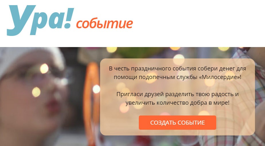 Он-лайн сервис «Ура! Событие» позволяет собирать средства для более чем 30 программ «Милосердия». Используя в качестве повода свой день рождения или годовщину свадьбы, с его помощью можно будет помочь бездомным, инвалидам, детям-сиротам, нуждающимся в медицинской помощи, многодетным и многим другим людям, которые оказались в сложной жизненной ситуации.