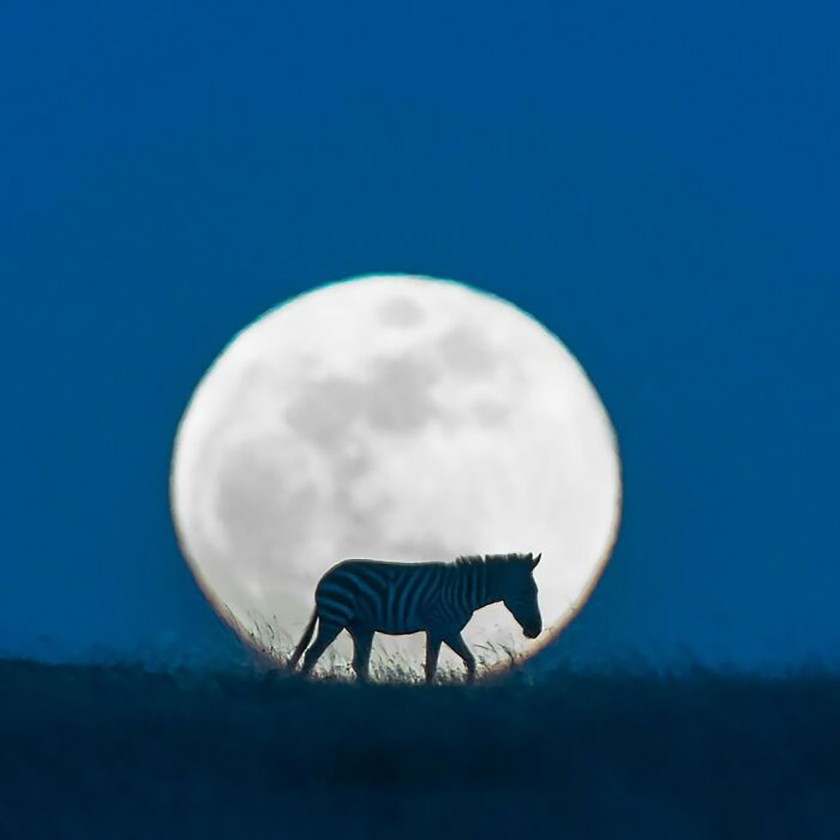 Силуэт зебры на фоне восходящей полной луны. Национальный парк Серенгети, Танзания.