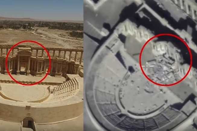 «Российский беспилотный летательный аппарат в ходе мониторинга города и прилегающих районов Пальмиры в Сирии зафиксировал факт варварского разрушения террористами ИГИЛ фасада римского амфитеатра и тетрапилона — главных достопримечательностей древнего города», – сообщает Минобороны.