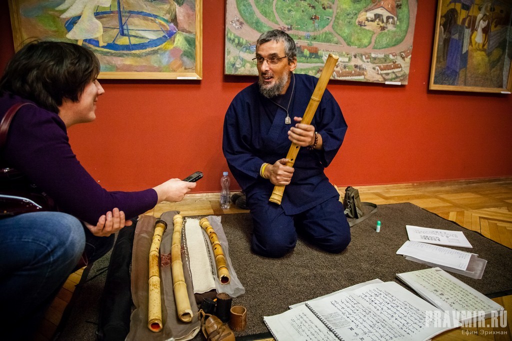 Перед началом сеанса в атмосферу японской культуры зрителей погружает музыка – в вестибюле, сидя по-японски на коленях, музыкант Георгий Мнацаканов играет на бамбуковой флейте. Пользуясь паузой в исполнении, спрашиваю об инструменте.