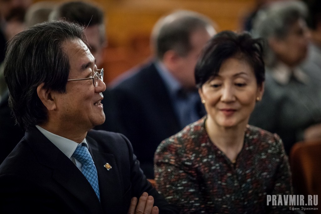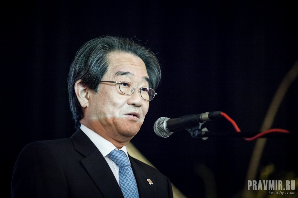 Открыл Вечер Чрезвычайный и Полномочный Посол Японии в России Тикахито Харада. Он рассказал, что вместе с супругой с нетерпением ждал презентации фильма, так как его семья особым образом связана со святителем Николаем: