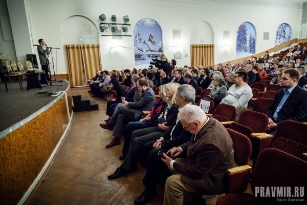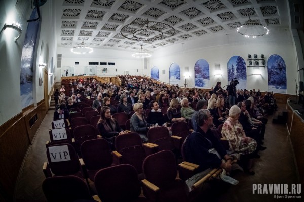 Белый зал Дома кино рассчитан на 550 мест и сегодня он почти полон – невероятное количество зрителей для сеанса документального кино. В фойе оживленно беседуют гости Вечера.