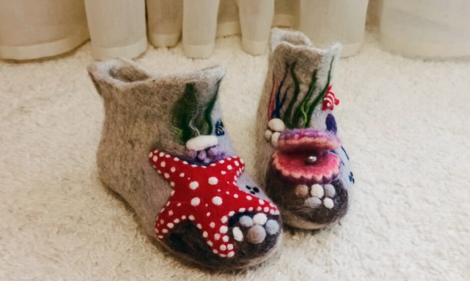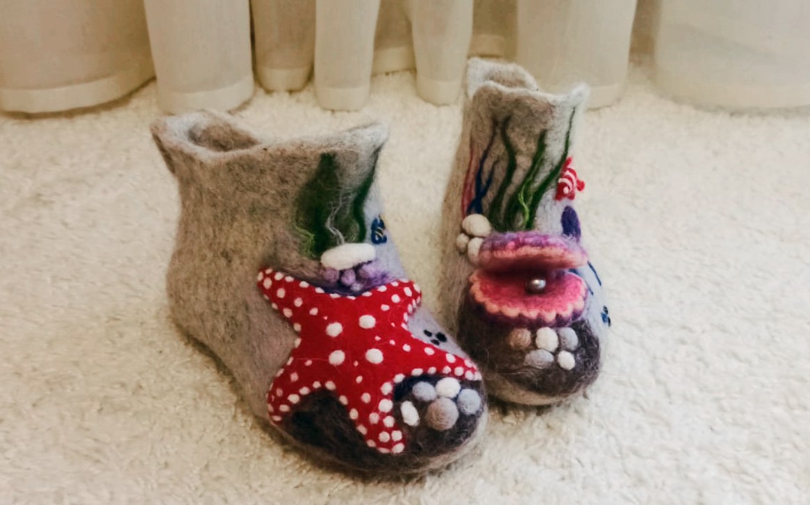 Когда дети подросли, Лена освоила технику валяния валенок. На изготовление пары уходит по две-три недели. Процесс включает в себя изготовление самих валенок, естественную просушку, работу с подошвой. Но самое интересное, по словам Лены, это дизайн.