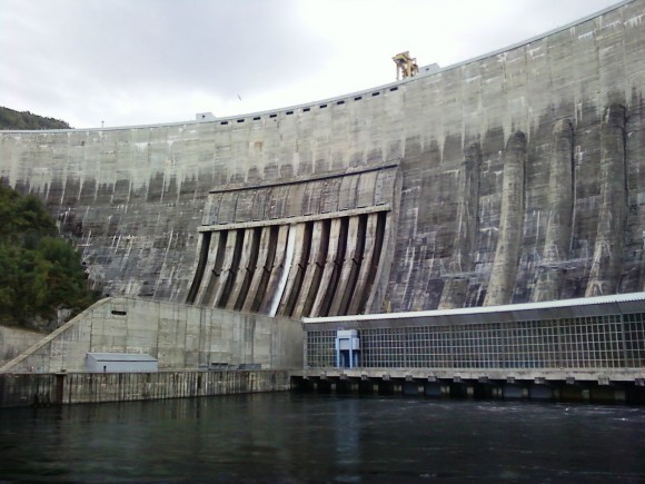 Саянские горы, Енисей, предзакатное солнце и величественная мощь сооружения ГЭС. Московскому гостю показали верхние и нижние бьефы — части реки, примыкающие к гидротехническому сооружению.